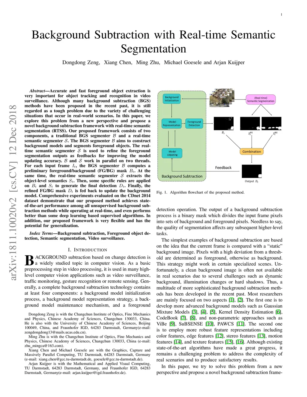 Accurate and fast foreground object extraction is very important for object tracking and recognition in video surveillance. Although many background subtraction (BGS) methods have been proposed in the recent past, it is still regarded as a tough problem due to the variety of challenging situations that occur in real-world scenarios. In this paper, we explore this problem from a new perspective and propose a novel background subtraction framework with real-time semantic segmentation (RTSS). Our proposed framework consists of two components, a traditional BGS segmenter and a real-time semantic segmenter . The BGS segmenter aims to construct background models and segments foreground objects. The real-time semantic segmenter is used to refine the foreground segmentation outputs as feedbacks for improving the model updating accuracy. and work in parallel on two threads. For each input frame , the BGS segmenter computes a preliminary foreground/background (FG/BG) mask . At the same time, the real-time semantic segmenter extracts the object-level semantics . Then, some specific rules are applied on and to generate the final detection . Finally, the refined FG/BG mask is fed back to update the background model. Comprehensive experiments evaluated on the CDnet 2014 dataset demonstrate that our proposed method achieves state-of-the-art performance among all unsupervised background subtraction methods while operating at real-time, and even performs better than some deep learning based supervised algorithms. In addition, our proposed framework is very flexible and has the potential for generalization.