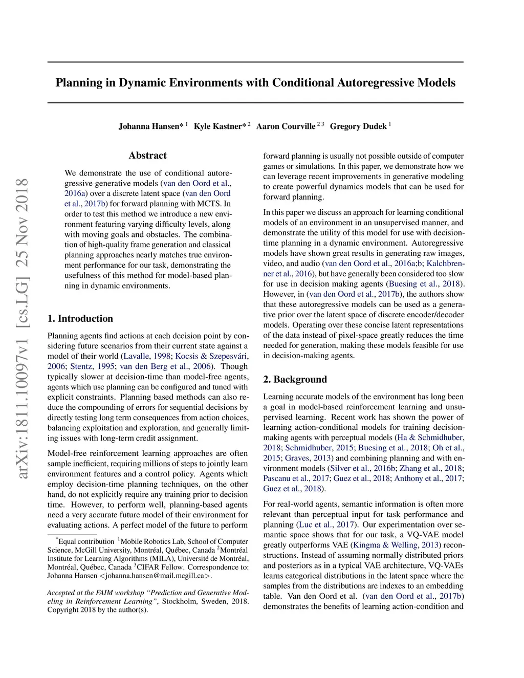We demonstrate the use of conditional autoregressive generative models (van den Oord et al., 2016a) over a discrete latent space (van den Oord et al., 2017b) for forward planning with MCTS. In order to test this method, we introduce a new environment featuring varying difficulty levels, along with moving goals and obstacles. The combination of high-quality frame generation and classical planning approaches nearly matches true environment performance for our task, demonstrating the usefulness of this method for model-based planning in dynamic environments.