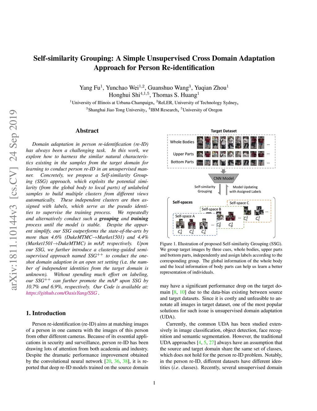 Domain adaptation in person re-identification (re-ID) has always been a challenging task. In this work, we explore how to harness the natural similar characteristics existing in the samples from the target domain for learning to conduct person re-ID in an unsupervised manner. Concretely, we propose a Self-similarity Grouping (SSG) approach, which exploits the potential similarity (from global body to local parts) of unlabeled samples to automatically build multiple clusters from different views. These independent clusters are then assigned with labels, which serve as the pseudo identities to supervise the training process. We repeatedly and alternatively conduct such a grouping and training process until the model is stable. Despite the apparent simplify, our SSG outperforms the state-of-the-arts by more than 4.6% (DukeMTMC to Market1501) and 4.4% (Market1501 to DukeMTMC) in mAP, respectively. Upon our SSG, we further introduce a clustering-guided semisupervised approach named SSG ++ to conduct the one-shot domain adaption in an open set setting (i.e. the number of independent identities from the target domain is unknown). Without spending much effort on labeling, our SSG ++ can further promote the mAP upon SSG by 10.7% and 6.9%, respectively. Our Code is available at: https://github.com/OasisYang/SSG .