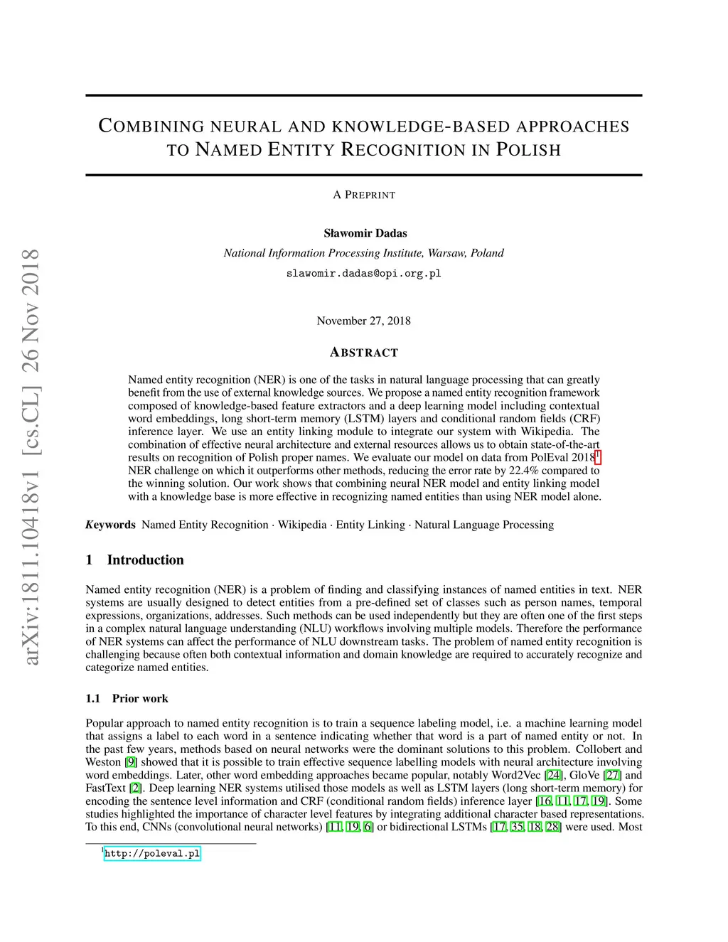 Named entity recognition (NER) is one of the tasks in natural language processing that can greatly benefit from the use of external knowledge sources. We propose a named entity recognition framework composed of knowledge-based feature extractors and a deep learning model including contextual word embeddings, long short-term memory (LSTM) layers and conditional random fields (CRF) inference layer. We use an entity linking module to integrate our system with Wikipedia. The combination of effective neural architecture and external resources allows us to obtain state-of-the-art results on recognition of Polish proper names. We evaluate our model on data from PolEval 2018 NER challenge on which it outperforms other methods, reducing the error rate by 22.4% compared to the winning solution. Our work shows that combining neural NER model and entity linking model with a knowledge base is more effective in recognizing named entities than using NER model alone.
