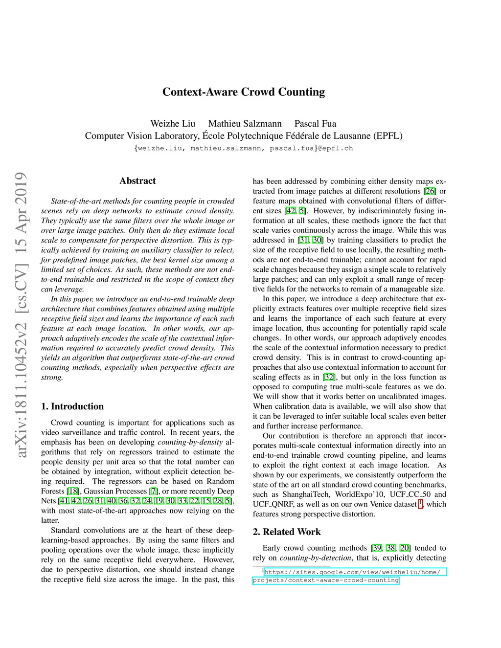 State-of-the-art methods for counting people in crowded scenes rely on deep networks to estimate crowd density. They typically use the same filters over the whole image or over large image patches. Only then do they estimate local scale to compensate for perspective distortion. This is typically achieved by training an auxiliary classifier to select, for predefined image patches, the best kernel size among a limited set of choices. As such, these methods are not end-to-end trainable and restricted in the scope of context they can leverage. In this paper, we introduce an end-to-end trainable deep architecture that combines features obtained using multiple receptive field sizes and learns the importance of each such feature at each image location. In other words, our approach adaptively encodes the scale of the contextual information required to accurately predict crowd density. This yields an algorithm that outperforms state-of-the-art crowd counting methods, especially when perspective effects are strong.