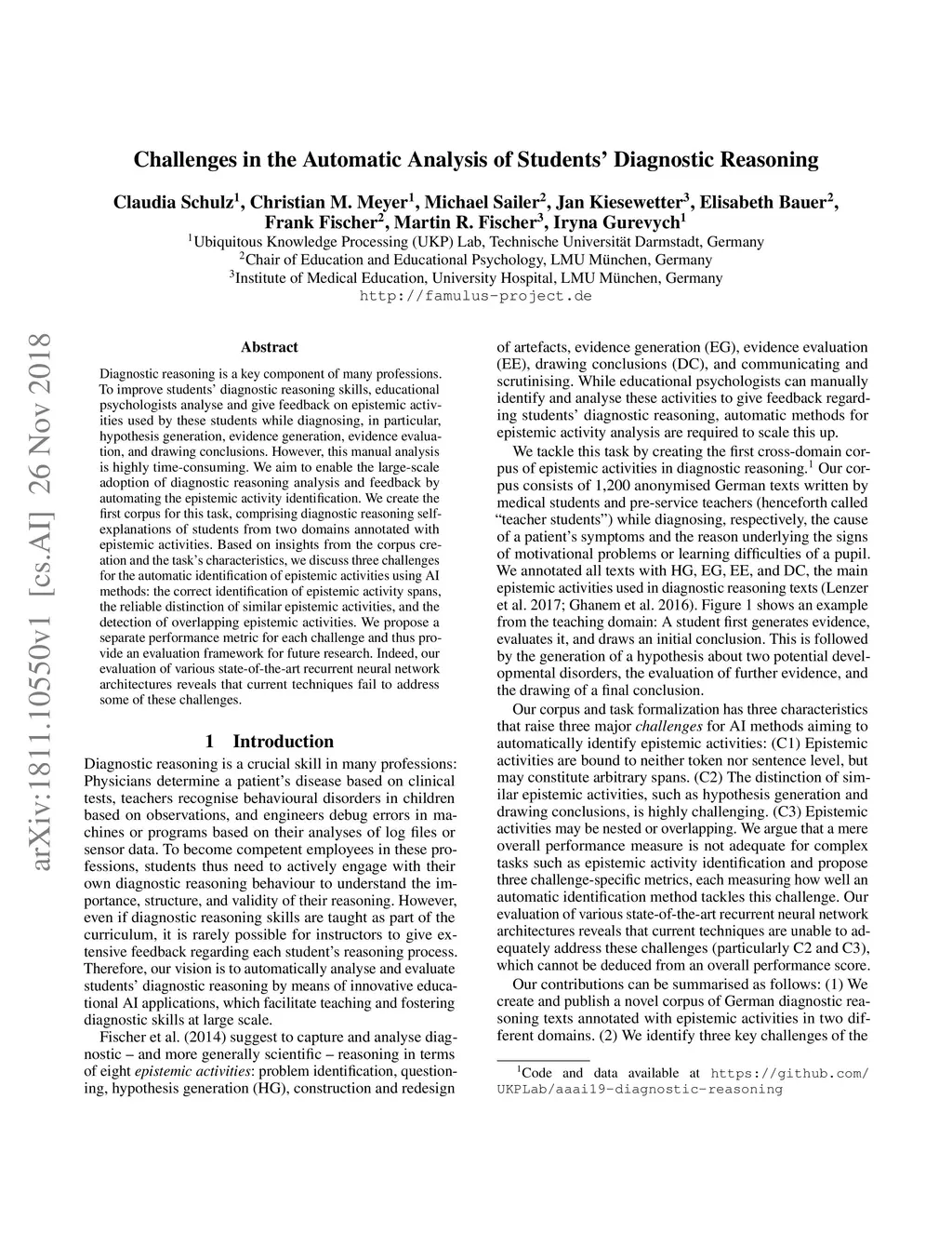 Diagnostic reasoning is a key component of many professions. To improve students' diagnostic reasoning skills, educational psychologists analyse and give feedback on epistemic activities used by these students while diagnosing, in particular, hypothesis generation, evidence generation, evidence evaluation, and drawing conclusions. However, this manual analysis is highly time-consuming. We aim to enable the large-scale adoption of diagnostic reasoning analysis and feedback by automating the epistemic activity identification. We create the first corpus for this task, comprising diagnostic reasoning self-explanations of students from two domains annotated with epistemic activities. Based on insights from the corpus creation and the task's characteristics, we discuss three challenges for the automatic identification of epistemic activities using AI methods: the correct identification of epistemic activity spans, the reliable distinction of similar epistemic activities, and the detection of overlapping epistemic activities. We propose a separate performance metric for each challenge and thus provide an evaluation framework for future research. Indeed, our evaluation of various state-of-the-art recurrent neural network architectures reveals that current techniques fail to address some of these challenges.