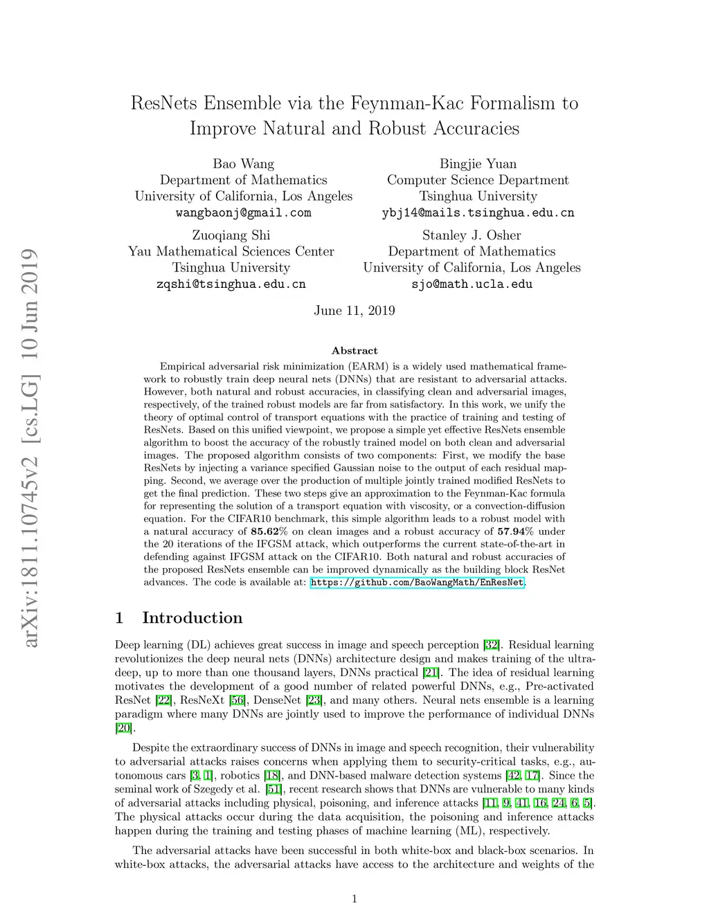 Empirical adversarial risk minimization (EARM) is a widely used mathematical framework to robustly train deep neural nets (DNNs) that are resistant to adversarial attacks. However, both natural and robust accuracies, in classifying clean and adversarial images, respectively, of the trained robust models are far from satisfactory. In this work, we unify the theory of optimal control of transport equations with the practice of training and testing of ResNets. Based on this unified viewpoint, we propose a simple yet effective ResNets ensemble algorithm to boost the accuracy of the robustly trained model on both clean and adversarial images. The proposed algorithm consists of two components: First, we modify the base ResNets by injecting a variance specified Gaussian noise to the output of each residual mapping. Second, we average over the production of multiple jointly trained modified ResNets to get the final prediction. These two steps give an approximation to the Feynman-Kac formula for representing the solution of a transport equation with viscosity, or a convection-diffusion equation. For the CIFAR10 benchmark, this simple algorithm leads to a robust model with a natural accuracy of {\bf 85.62}\% on clean images and a robust accuracy of under the 20 iterations of the IFGSM attack, which outperforms the current state-of-the-art in defending against IFGSM attack on the CIFAR10. Both natural and robust accuracies of the proposed ResNets ensemble can be improved dynamically as the building block ResNet advances. The code is available at: \url{https://github.com/BaoWangMath/EnResNet}.