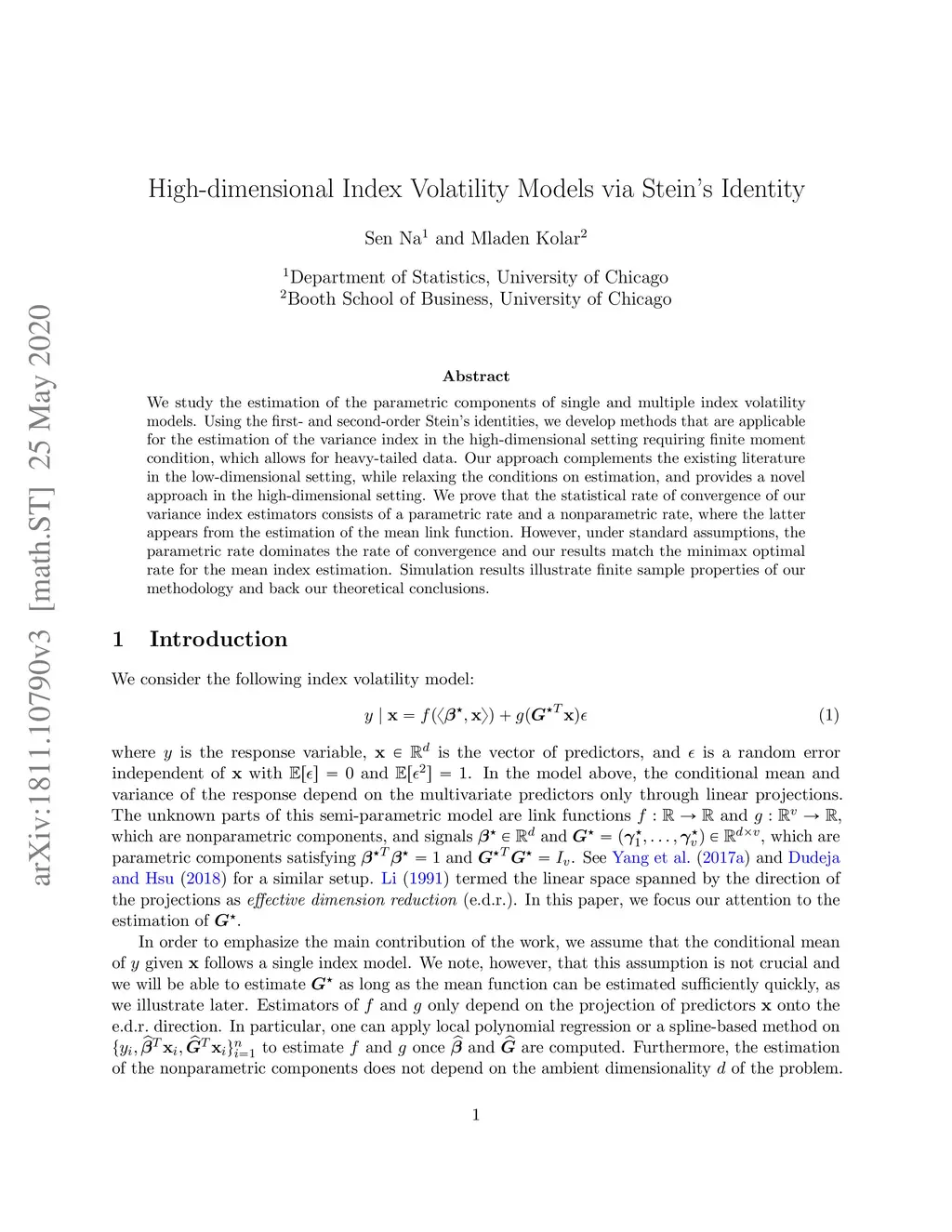 We study the estimation of the parametric components of single and multiple index volatility models. Using the first- and second-order Stein's identities, we develop methods that are applicable for the estimation of the variance index in the high-dimensional setting requiring finite moment condition, which allows for heavy-tailed data. Our approach complements the existing literature in the low-dimensional setting, while relaxing the conditions on estimation, and provides a novel approach in the high-dimensional setting. We prove that the statistical rate of convergence of our variance index estimators consists of a parametric rate and a nonparametric rate, where the latter appears from the estimation of the mean link function. However, under standard assumptions, the parametric rate dominates the rate of convergence and our results match the minimax optimal rate for the mean index estimation. Simulation results illustrate finite sample properties of our methodology and back our theoretical conclusions.
