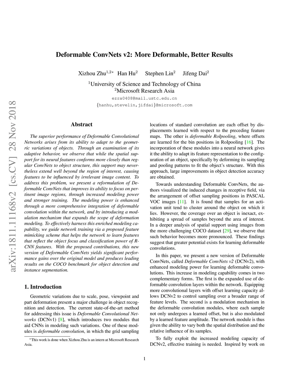 The superior performance of Deformable Convolutional Networks arises from its ability to adapt to the geometric variations of objects. Through an examination of its adaptive behavior, we observe that while the spatial support for its neural features conforms more closely than regular ConvNets to object structure, this support may nevertheless extend well beyond the region of interest, causing features to be influenced by irrelevant image content. To address this problem, we present a reformulation of Deformable ConvNets that improves its ability to focus on pertinent image regions, through increased modeling power and stronger training. The modeling power is enhanced through a more comprehensive integration of deformable convolution within the network, and by introducing a modulation mechanism that expands the scope of deformation modeling. To effectively harness this enriched modeling capability, we guide network training via a proposed feature mimicking scheme that helps the network to learn features that reflect the object focus and classification power of R-CNN features. With the proposed contributions, this new version of Deformable ConvNets yields significant performance gains over the original model and produces leading results on the COCO benchmark for object detection and instance segmentation.