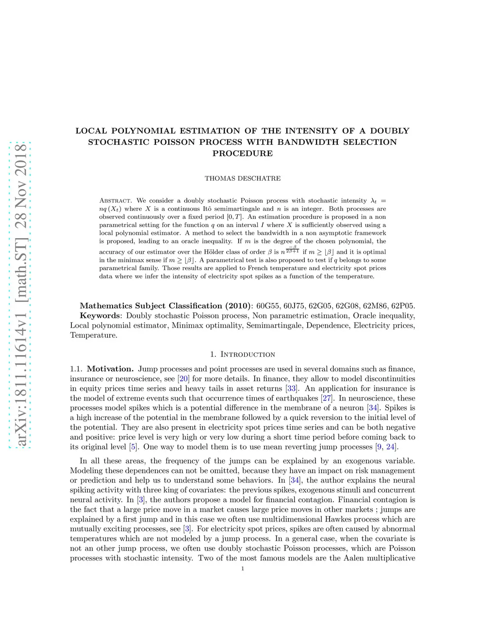 We consider a doubly stochastic Poisson process with stochastic intensity where is a continuous It\^o semimartingale and is an integer. Both processes are observed continuously over a fixed period . An estimation procedure is proposed in a non parametrical setting for the function on an interval where is sufficiently observed using a local polynomial estimator. A method to select the bandwidth in a non asymptotic framework is proposed, leading to an oracle inequality. If is the degree of the chosen polynomial, the accuracy of our estimator over the H\"older class of order is if and it is optimal in the minimax sense if . A parametrical test is also proposed to test if belongs to some parametrical family. Those results are applied to French temperature and electricity spot prices data where we infer the intensity of electricity spot spikes as a function of the temperature.