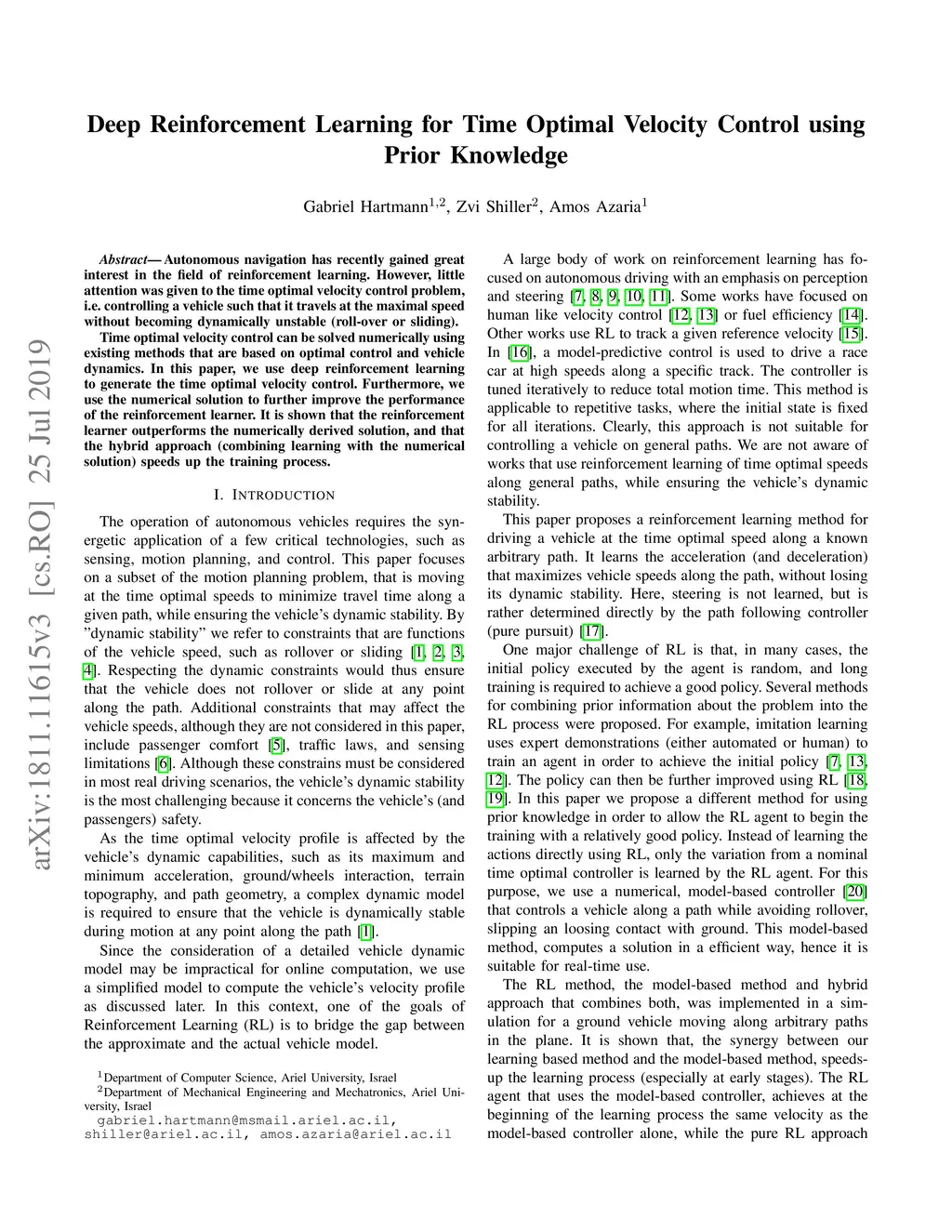 Autonomous navigation has recently gained great interest in the field of reinforcement learning. However, little attention was given to the time optimal velocity control problem, i.e. controlling a vehicle such that it travels at the maximal speed without becoming dynamically unstable (roll-over or sliding). Time optimal velocity control can be solved numerically using existing methods that are based on optimal control and vehicle dynamics. In this paper, we use deep reinforcement learning to generate the time optimal velocity control. Furthermore, we use the numerical solution to further improve the performance of the reinforcement learner. It is shown that the reinforcement learner outperforms the numerically derived solution, and that the hybrid approach (combining learning with the numerical solution) speeds up the training process.