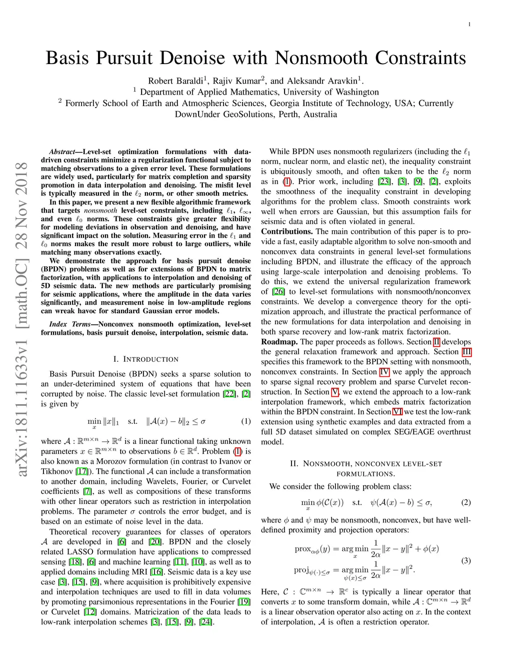 Level-set optimization formulations with data-driven constraints minimize a regularization functional subject to matching observations to a given error level. These formulations are widely used, particularly for matrix completion and sparsity promotion in data interpolation and denoising. The misfit level is typically measured in the l2 norm, or other smooth metrics. In this paper, we present a new flexible algorithmic framework that targets nonsmooth level-set constraints, including L1, Linf, and even L0 norms. These constraints give greater flexibility for modeling deviations in observation and denoising, and have significant impact on the solution. Measuring error in the L1 and L0 norms makes the result more robust to large outliers, while matching many observations exactly. We demonstrate the approach for basis pursuit denoise (BPDN) problems as well as for extensions of BPDN to matrix factorization, with applications to interpolation and denoising of 5D seismic data. The new methods are particularly promising for seismic applications, where the amplitude in the data varies significantly, and measurement noise in low-amplitude regions can wreak havoc for standard Gaussian error models.