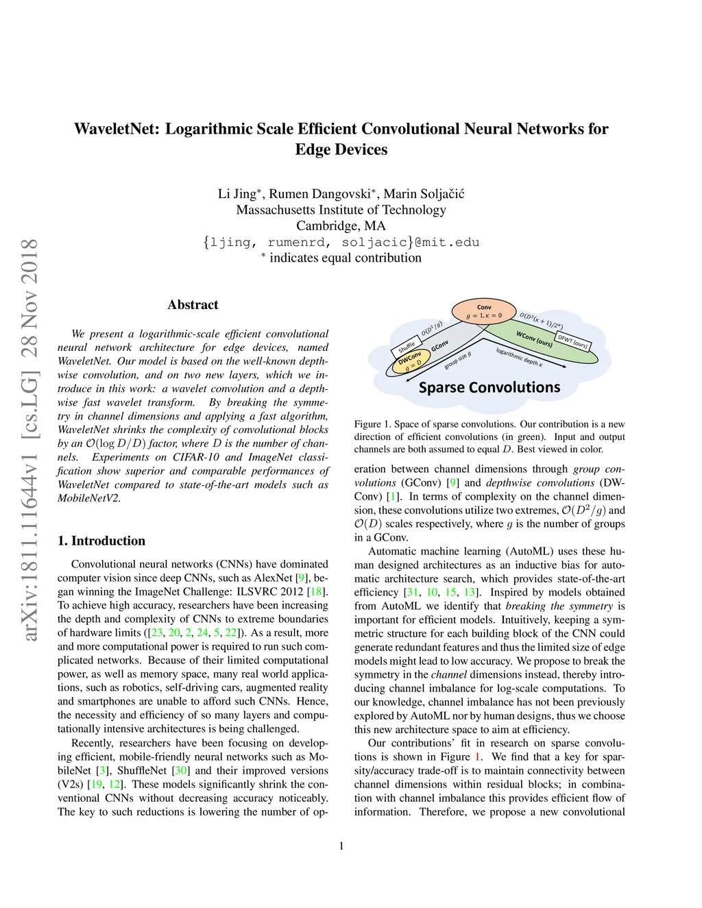 We present a logarithmic-scale efficient convolutional neural network architecture for edge devices, named WaveletNet. Our model is based on the well-known depthwise convolution, and on two new layers, which we introduce in this work: a wavelet convolution and a depthwise fast wavelet transform. By breaking the symmetry in channel dimensions and applying a fast algorithm, WaveletNet shrinks the complexity of convolutional blocks by an O(logD/D) factor, where D is the number of channels. Experiments on CIFAR-10 and ImageNet classification show superior and comparable performances of WaveletNet compared to state-of-the-art models such as MobileNetV2.