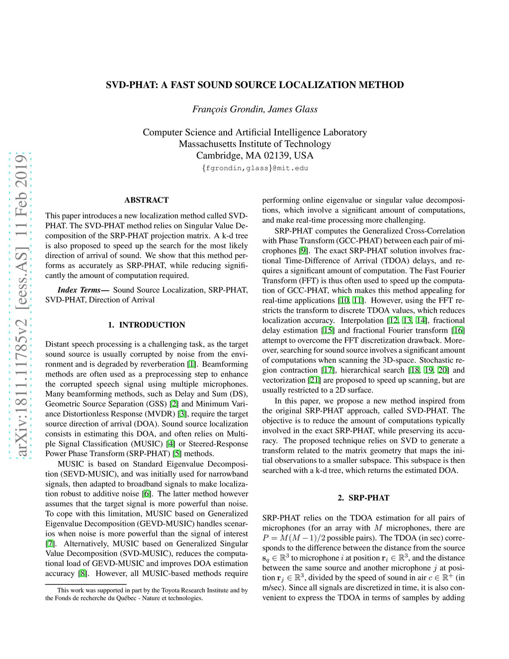 This paper introduces a new localization method called SVD-PHAT. The SVD-PHAT method relies on Singular Value Decomposition of the SRP-PHAT projection matrix. A k-d tree is also proposed to speed up the search for the most likely direction of arrival of sound. We show that this method performs as accurately as SRP-PHAT, while reducing significantly the amount of computation required.
