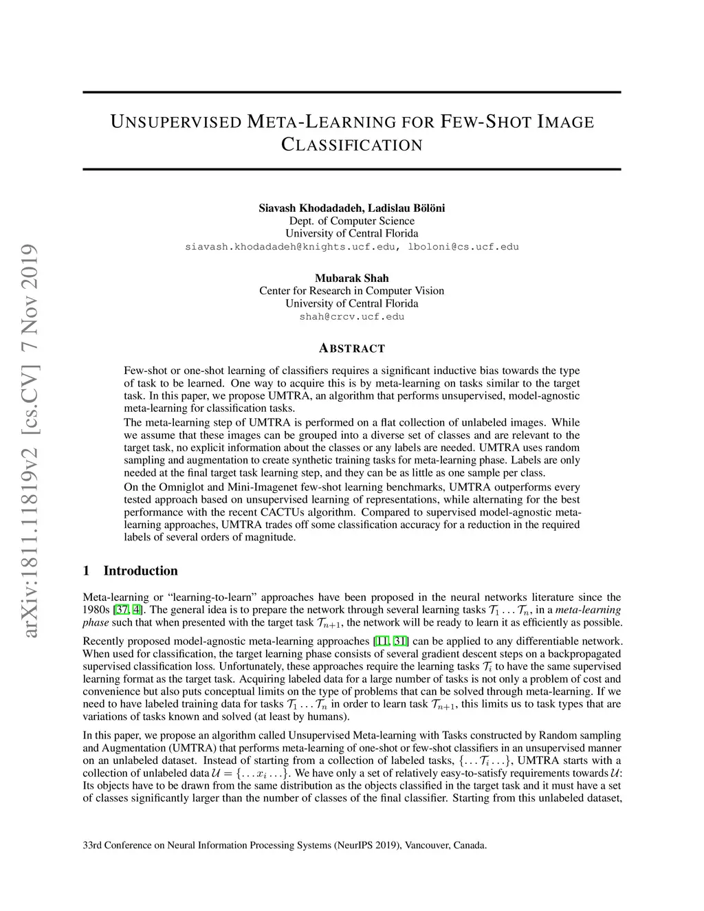 Few-shot or one-shot learning of classifiers requires a significant inductive bias towards the type of task to be learned. One way to acquire this is by meta-learning on tasks similar to the target task. In this paper, we propose UMTRA, an algorithm that performs unsupervised, model-agnostic meta-learning for classification tasks. The meta-learning step of UMTRA is performed on a flat collection of unlabeled images. While we assume that these images can be grouped into a diverse set of classes and are relevant to the target task, no explicit information about the classes or any labels are needed. UMTRA uses random sampling and augmentation to create synthetic training tasks for meta-learning phase. Labels are only needed at the final target task learning step, and they can be as little as one sample per class. On the Omniglot and Mini-Imagenet few-shot learning benchmarks, UMTRA outperforms every tested approach based on unsupervised learning of representations, while alternating for the best performance with the recent CACTUs algorithm. Compared to supervised model-agnostic meta-learning approaches, UMTRA trades off some classification accuracy for a reduction in the required labels of several orders of magnitude.