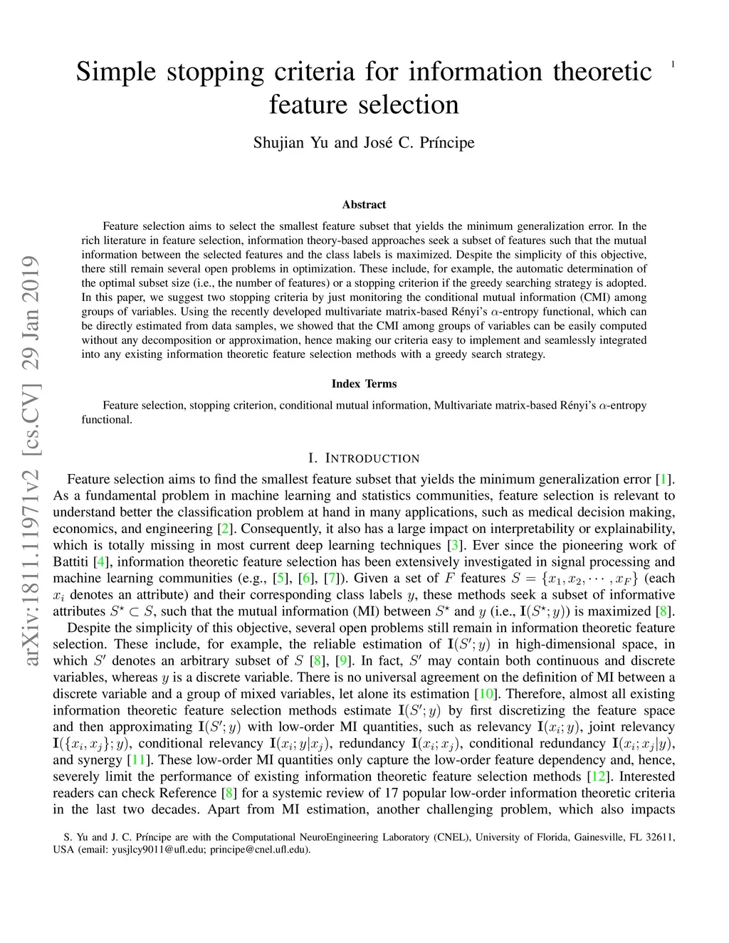 Feature selection aims to select the smallest feature subset that yields the minimum generalization error. In the rich literature in feature selection, information theory-based approaches seek a subset of features such that the mutual information between the selected features and the class labels is maximized. Despite the simplicity of this objective, there still remain several open problems in optimization. These include, for example, the automatic determination of the optimal subset size (i.e., the number of features) or a stopping criterion if the greedy searching strategy is adopted. In this paper, we suggest two stopping criteria by just monitoring the conditional mutual information (CMI) among groups of variables. Using the recently developed multivariate matrix-based Renyi's \alpha-entropy functional, which can be directly estimated from data samples, we showed that the CMI among groups of variables can be easily computed without any decomposition or approximation, hence making our criteria easy to implement and seamlessly integrated into any existing information theoretic feature selection methods with a greedy search strategy.