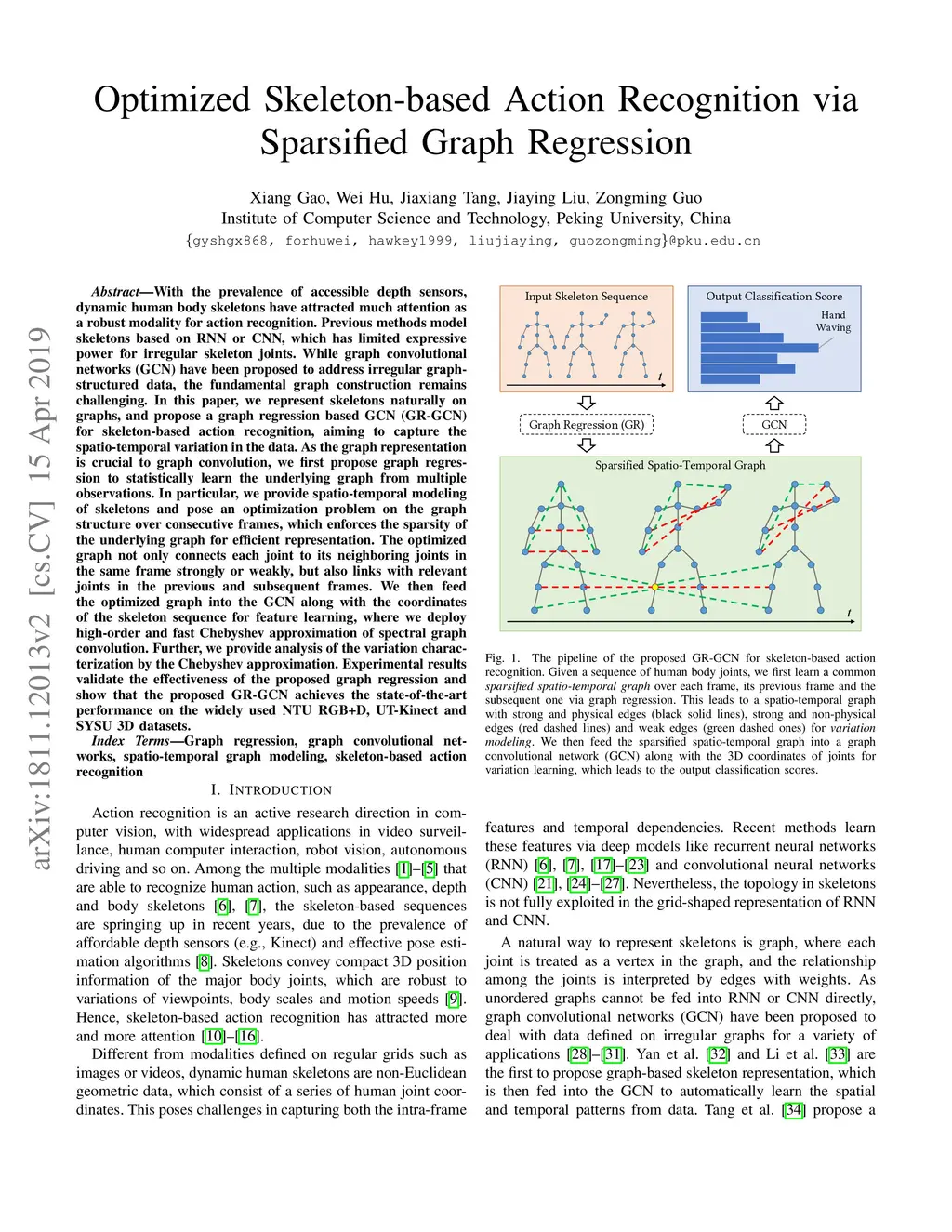With the prevalence of accessible depth sensors, dynamic human body skeletons have attracted much attention as a robust modality for action recognition. Previous methods model skeletons based on RNN or CNN, which has limited expressive power for irregular skeleton joints. While graph convolutional networks (GCN) have been proposed to address irregular graph-structured data, the fundamental graph construction remains challenging. In this paper, we represent skeletons naturally on graphs, and propose a graph regression based GCN (GR-GCN) for skeleton-based action recognition, aiming to capture the spatio-temporal variation in the data. As the graph representation is crucial to graph convolution, we first propose graph regression to statistically learn the underlying graph from multiple observations. In particular, we provide spatio-temporal modeling of skeletons and pose an optimization problem on the graph structure over consecutive frames, which enforces the sparsity of the underlying graph for efficient representation. The optimized graph not only connects each joint to its neighboring joints in the same frame strongly or weakly, but also links with relevant joints in the previous and subsequent frames. We then feed the optimized graph into the GCN along with the coordinates of the skeleton sequence for feature learning, where we deploy high-order and fast Chebyshev approximation of spectral graph convolution. Further, we provide analysis of the variation characterization by the Chebyshev approximation. Experimental results validate the effectiveness of the proposed graph regression and show that the proposed GR-GCN achieves the state-of-the-art performance on the widely used NTU RGB+D, UT-Kinect and SYSU 3D datasets.