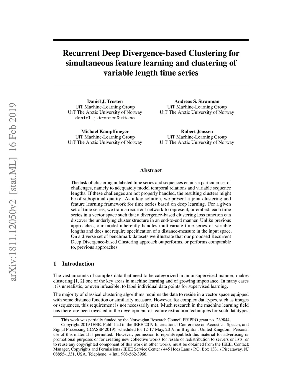 The task of clustering unlabeled time series and sequences entails a particular set of challenges, namely to adequately model temporal relations and variable sequence lengths. If these challenges are not properly handled, the resulting clusters might be of suboptimal quality. As a key solution, we present a joint clustering and feature learning framework for time series based on deep learning. For a given set of time series, we train a recurrent network to represent, or embed, each time series in a vector space such that a divergence-based clustering loss function can discover the underlying cluster structure in an end-to-end manner. Unlike previous approaches, our model inherently handles multivariate time series of variable lengths and does not require specification of a distance-measure in the input space. On a diverse set of benchmark datasets we illustrate that our proposed Recurrent Deep Divergence-based Clustering approach outperforms, or performs comparable to, previous approaches.