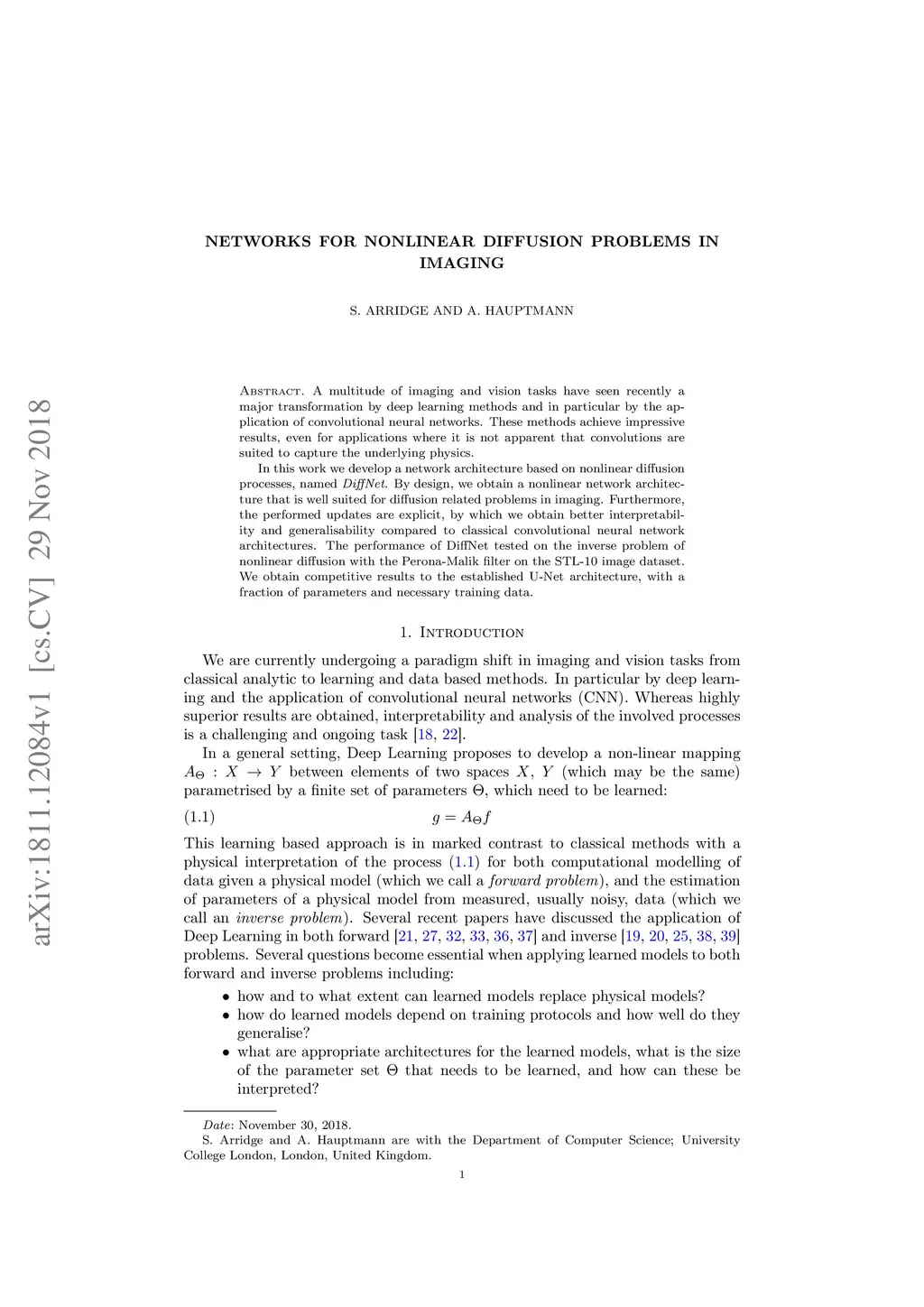 A multitude of imaging and vision tasks have seen recently a major transformation by deep learning methods and in particular by the application of convolutional neural networks. These methods achieve impressive results, even for applications where it is not apparent that convolutions are suited to capture the underlying physics. In this work we develop a network architecture based on nonlinear diffusion processes, named DiffNet. By design, we obtain a nonlinear network architecture that is well suited for diffusion related problems in imaging. Furthermore, the performed updates are explicit, by which we obtain better interpretability and generalisability compared to classical convolutional neural network architectures. The performance of DiffNet tested on the inverse problem of nonlinear diffusion with the Perona-Malik filter on the STL-10 image dataset. We obtain competitive results to the established U-Net architecture, with a fraction of parameters and necessary training data.