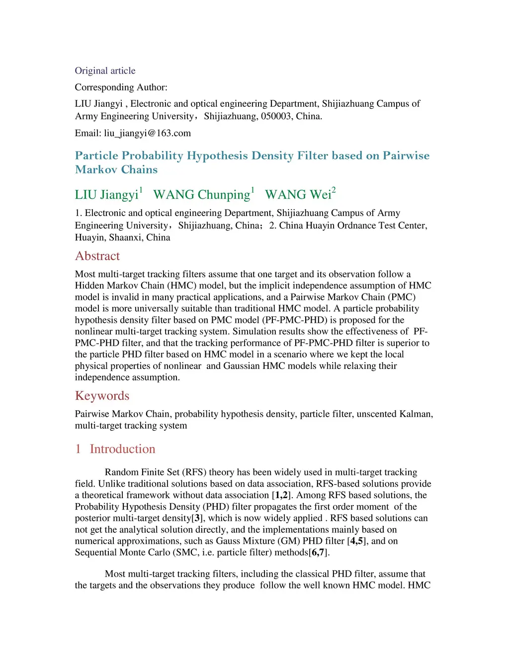Most multi-target tracking filters assume that one target and its observation follow a Hidden Markov Chain (HMC) model, but the implicit independence assumption of HMC model is invalid in many practical applications, and a Pairwise Markov Chain (PMC) model is more universally suitable than traditional HMC model. A particle probability hypothesis density filter based on PMC model (PF-PMC-PHD) is proposed for the nonlinear multi-target tracking system. Simulation results show the effectiveness of PF-PMC-PHD filter, and that the tracking performance of PF-PMC-PHD filter is superior to the particle PHD filter based on HMC model in a scenario where we kept the local physical properties of nonlinear and Gaussian HMC models while relaxing their independence assumption.