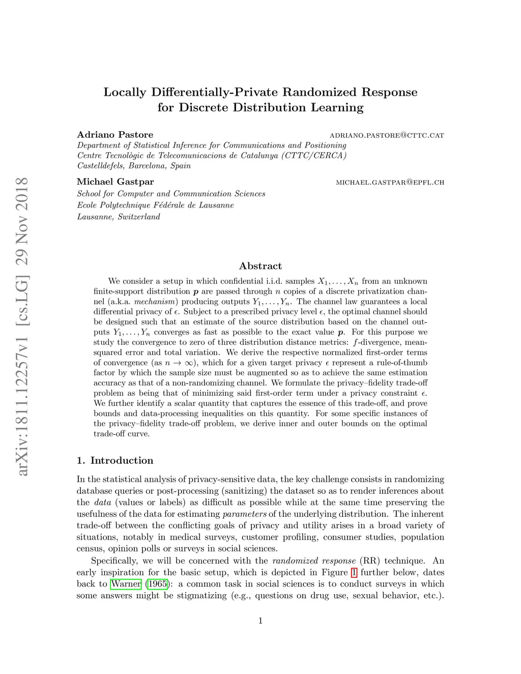 We consider a setup in which confidential i.i.d. samples from an unknown finite-support distribution are passed through copies of a discrete privatization channel (a.k.a. mechanism) producing outputs . The channel law guarantees a local differential privacy of . Subject to a prescribed privacy level , the optimal channel should be designed such that an estimate of the source distribution based on the channel outputs converges as fast as possible to the exact value . For this purpose we study the convergence to zero of three distribution distance metrics: -divergence, mean-squared error and total variation. We derive the respective normalized first-order terms of convergence (as ), which for a given target privacy represent a rule-of-thumb factor by which the sample size must be augmented so as to achieve the same estimation accuracy as that of a non-randomizing channel. We formulate the privacy-fidelity trade-off problem as being that of minimizing said first-order term under a privacy constraint . We further identify a scalar quantity that captures the essence of this trade-off, and prove bounds and data-processing inequalities on this quantity. For some specific instances of the privacy-fidelity trade-off problem, we derive inner and outer bounds on the optimal trade-off curve.