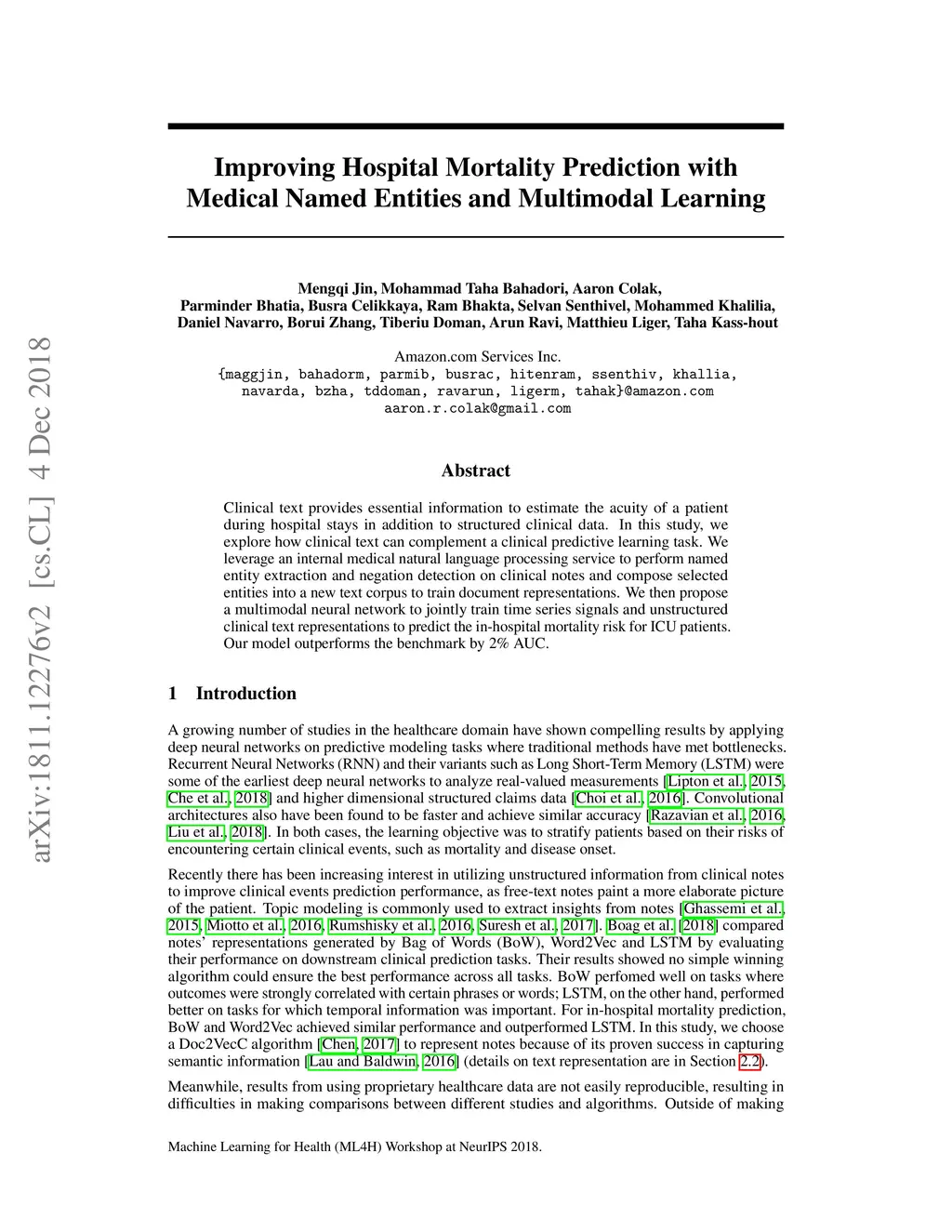 Clinical text provides essential information to estimate the acuity of a patient during hospital stays in addition to structured clinical data. In this study, we explore how clinical text can complement a clinical predictive learning task. We leverage an internal medical natural language processing service to perform named entity extraction and negation detection on clinical notes and compose selected entities into a new text corpus to train document representations. We then propose a multimodal neural network to jointly train time series signals and unstructured clinical text representations to predict the in-hospital mortality risk for ICU patients. Our model outperforms the benchmark by 2% AUC.