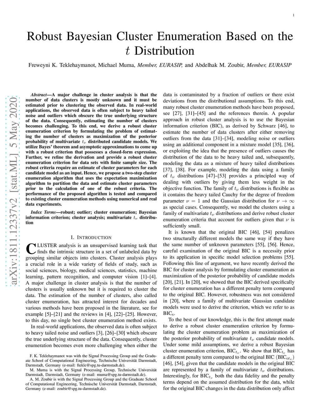A major challenge in cluster analysis is that the number of data clusters is mostly unknown and it must be estimated prior to clustering the observed data. In real-world applications, the observed data is often subject to heavy tailed noise and outliers which obscure the true underlying structure of the data. Consequently, estimating the number of clusters becomes challenging. To this end, we derive a robust cluster enumeration criterion by formulating the problem of estimating the number of clusters as maximization of the posterior probability of multivariate distributed candidate models. We utilize Bayes' theorem and asymptotic approximations to come up with a robust criterion that possesses a closed-form expression. Further, we refine the derivation and provide a robust cluster enumeration criterion for data sets with finite sample size. The robust criteria require an estimate of cluster parameters for each candidate model as an input. Hence, we propose a two-step cluster enumeration algorithm that uses the expectation maximization algorithm to partition the data and estimate cluster parameters prior to the calculation of one of the robust criteria. The performance of the proposed algorithm is tested and compared to existing cluster enumeration methods using numerical and real data experiments.