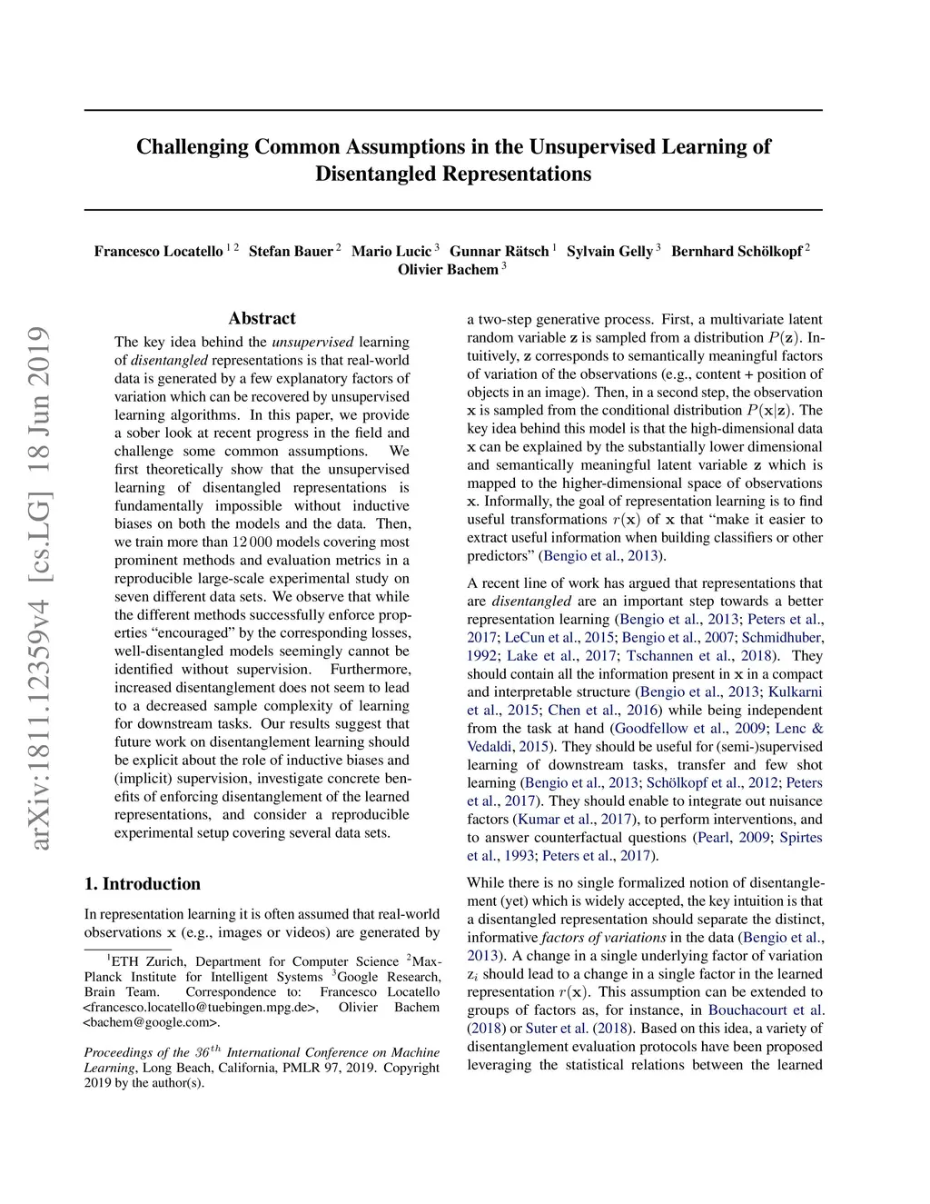 The key idea behind the unsupervised learning of disentangled representations is that real-world data is generated by a few explanatory factors of variation which can be recovered by unsupervised learning algorithms. In this paper, we provide a sober look at recent progress in the field and challenge some common assumptions. We first theoretically show that the unsupervised learning of disentangled representations is fundamentally impossible without inductive biases on both the models and the data. Then, we train more than 12000 models covering most prominent methods and evaluation metrics in a reproducible large-scale experimental study on seven different data sets. We observe that while the different methods successfully enforce properties ``encouraged'' by the corresponding losses, well-disentangled models seemingly cannot be identified without supervision. Furthermore, increased disentanglement does not seem to lead to a decreased sample complexity of learning for downstream tasks. Our results suggest that future work on disentanglement learning should be explicit about the role of inductive biases and (implicit) supervision, investigate concrete benefits of enforcing disentanglement of the learned representations, and consider a reproducible experimental setup covering several data sets.