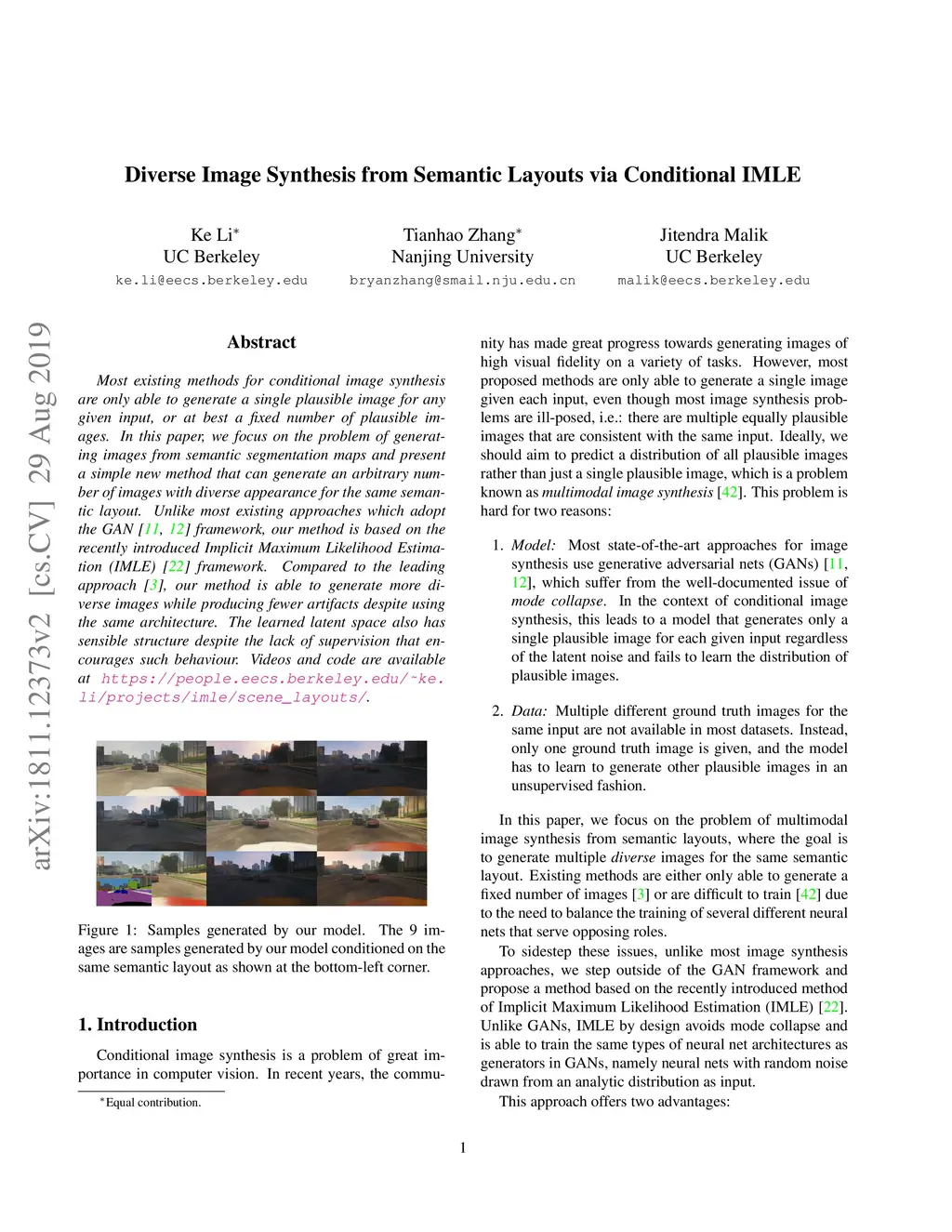 Most existing methods for conditional image synthesis are only able to generate a single plausible image for any given input, or at best a fixed number of plausible images. In this paper, we focus on the problem of generating images from semantic segmentation maps and present a simple new method that can generate an arbitrary number of images with diverse appearance for the same semantic layout. Unlike most existing approaches which adopt the GAN framework, our method is based on the recently introduced Implicit Maximum Likelihood Estimation (IMLE) framework. Compared to the leading approach, our method is able to generate more diverse images while producing fewer artifacts despite using the same architecture. The learned latent space also has sensible structure despite the lack of supervision that encourages such behaviour. Videos and code are available at https://people.eecs.berkeley.edu/~ke.li/projects/imle/scene_layouts/.