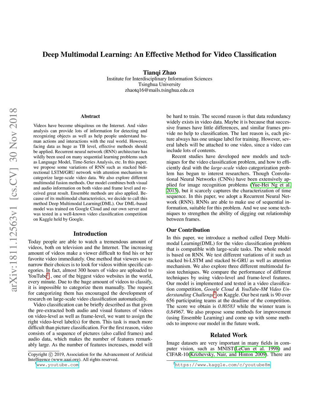 Videos have become ubiquitous on the Internet. And video analysis can provide lots of information for detecting and recognizing objects as well as help people understand human actions and interactions with the real world. However, facing data as huge as TB level, effective methods should be applied. Recurrent neural network (RNN) architecture has wildly been used on many sequential learning problems such as Language Model, Time-Series Analysis, etc. In this paper, we propose some variations of RNN such as stacked bidirectional LSTM/GRU network with attention mechanism to categorize large-scale video data. We also explore different multimodal fusion methods. Our model combines both visual and audio information on both video and frame level and received great result. Ensemble methods are also applied. Because of its multimodal characteristics, we decide to call this method Deep Multimodal Learning(DML). Our DML-based model was trained on Google Cloud and our own server and was tested in a well-known video classification competition on Kaggle held by Google.