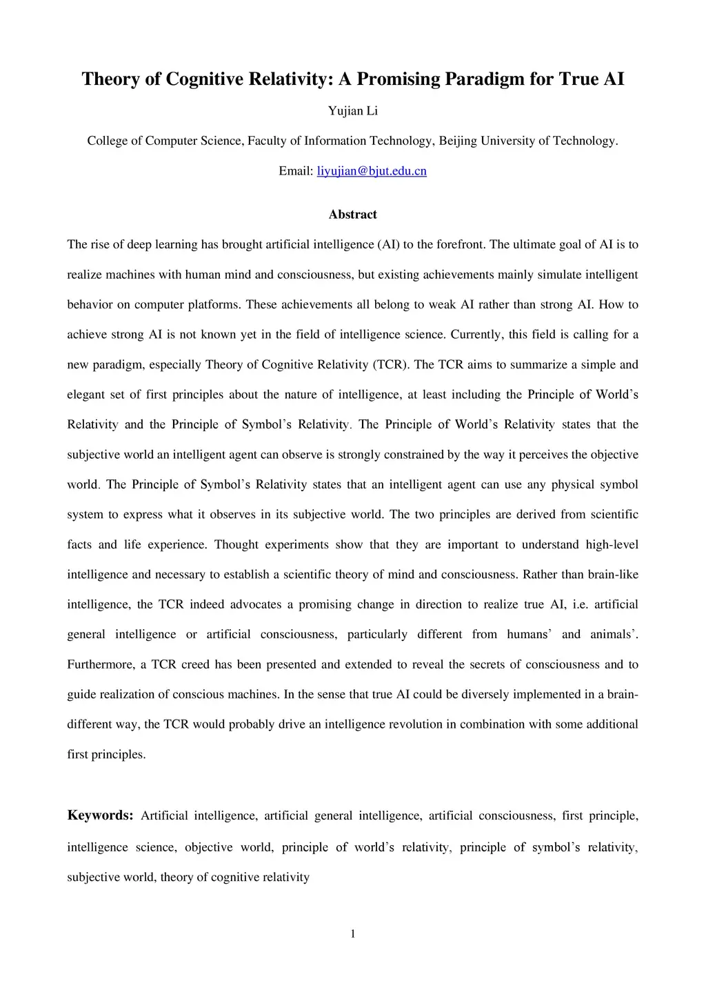 The rise of deep learning has brought artificial intelligence (AI) to the forefront. The ultimate goal of AI is to realize machines with human mind and consciousness, but existing achievements mainly simulate intelligent behavior on computer platforms. These achievements all belong to weak AI rather than strong AI. How to achieve strong AI is not known yet in the field of intelligence science. Currently, this field is calling for a new paradigm, especially Theory of Cognitive Relativity (TCR). The TCR aims to summarize a simple and elegant set of first principles about the nature of intelligence, at least including the Principle of World's Relativity and the Principle of Symbol's Relativity. The Principle of World's Relativity states that the subjective world an intelligent agent can observe is strongly constrained by the way it perceives the objective world. The Principle of Symbol's Relativity states that an intelligent agent can use any physical symbol system to express what it observes in its subjective world. The two principles are derived from scientific facts and life experience. Thought experiments show that they are important to understand high-level intelligence and necessary to establish a scientific theory of mind and consciousness. Rather than brain-like intelligence, the TCR indeed advocates a promising change in direction to realize true AI, i.e. artificial general intelligence or artificial consciousness, particularly different from humans' and animals'. Furthermore, a TCR creed has been presented and extended to reveal the secrets of consciousness and to guide realization of conscious machines. In the sense that true AI could be diversely implemented in a brain-different way, the TCR would probably drive an intelligence revolution in combination with some additional first principles.