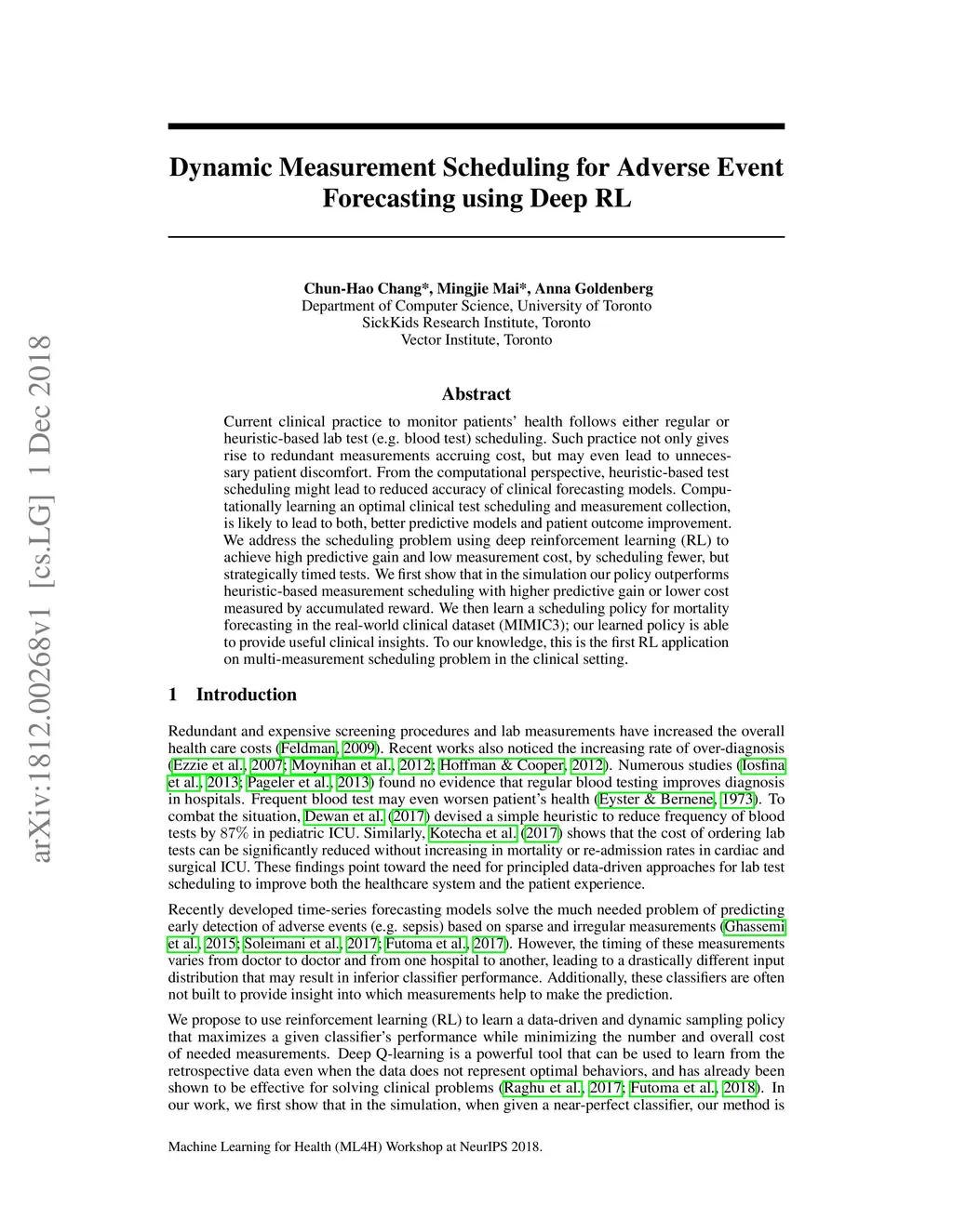 Current clinical practice to monitor patients' health follows either regular or heuristic-based lab test (e.g. blood test) scheduling. Such practice not only gives rise to redundant measurements accruing cost, but may even lead to unnecessary patient discomfort. From the computational perspective, heuristic-based test scheduling might lead to reduced accuracy of clinical forecasting models. Computationally learning an optimal clinical test scheduling and measurement collection, is likely to lead to both, better predictive models and patient outcome improvement. We address the scheduling problem using deep reinforcement learning (RL) to achieve high predictive gain and low measurement cost, by scheduling fewer, but strategically timed tests. We first show that in the simulation our policy outperforms heuristic-based measurement scheduling with higher predictive gain or lower cost measured by accumulated reward. We then learn a scheduling policy for mortality forecasting in the real-world clinical dataset (MIMIC3), our learned policy is able to provide useful clinical insights. To our knowledge, this is the first RL application on multi-measurement scheduling problem in the clinical setting.