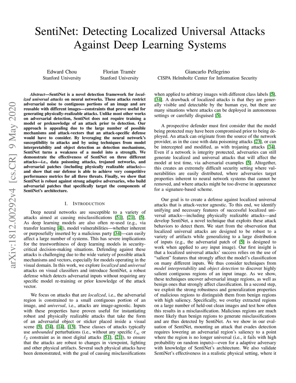 SentiNet: Detecting Localized Universal Attacks Against Deep Learning