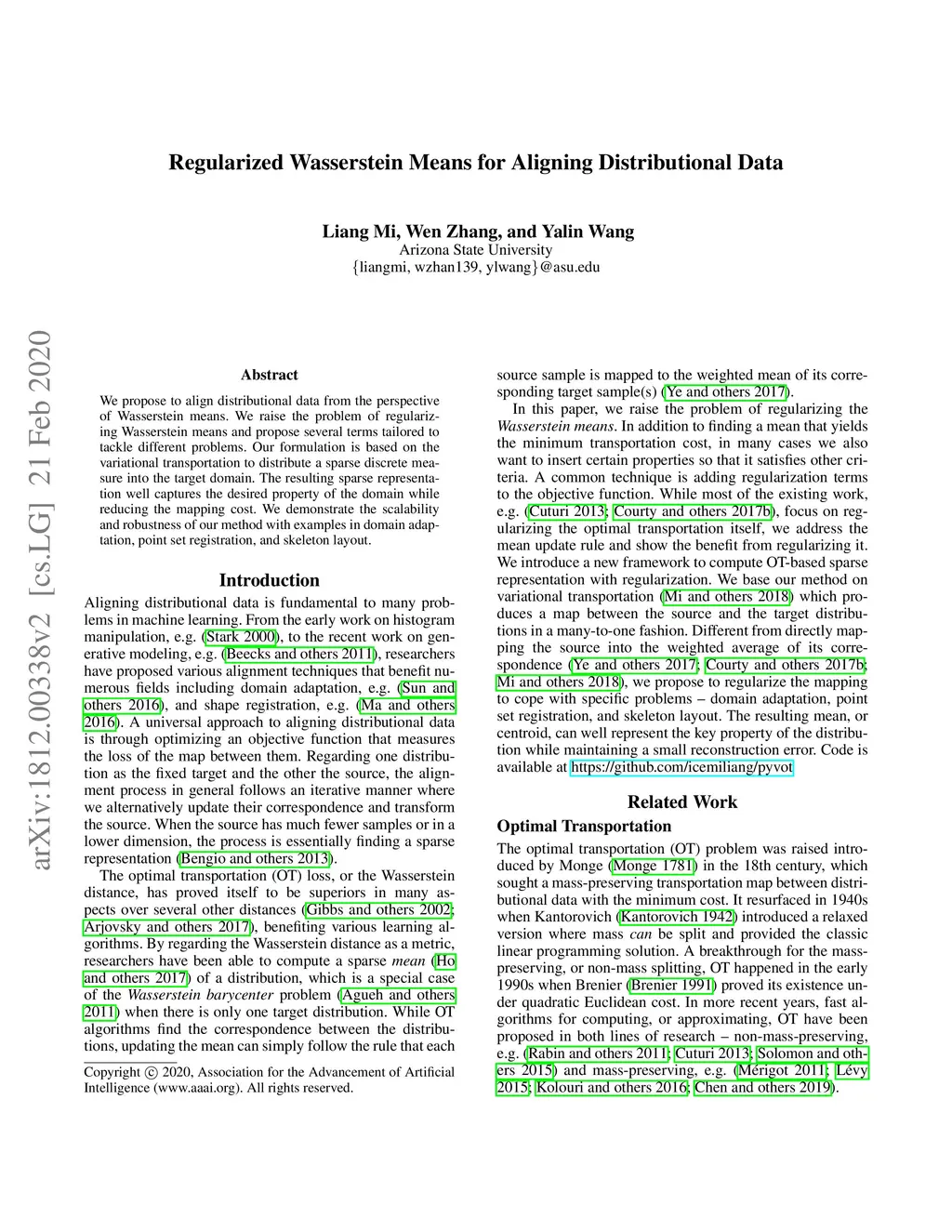 We propose to align distributional data from the perspective of Wasserstein means. We raise the problem of regularizing Wasserstein means and propose several terms tailored to tackle different problems. Our formulation is based on the variational transportation to distribute a sparse discrete measure into the target domain. The resulting sparse representation well captures the desired property of the domain while reducing the mapping cost. We demonstrate the scalability and robustness of our method with examples in domain adaptation, point set registration, and skeleton layout.