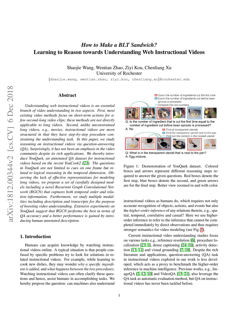 Understanding web instructional videos is an essential branch of video understanding in two aspects. First, most existing video methods focus on short-term actions for a-few-second-long video clips; these methods are not directly applicable to long videos. Second, unlike unconstrained long videos, e.g., movies, instructional videos are more structured in that they have step-by-step procedure constraining the understanding task. In this paper, we study reasoning on instructional videos via question-answering (QA). Surprisingly, it has not been an emphasis in the video community despite its rich applications. We thereby introduce YouQuek, an annotated QA dataset for instructional videos based on the recent YouCook2. The questions in YouQuek are not limited to cues on one frame but related to logical reasoning in the temporal dimension. Observing the lack of effective representations for modeling long videos, we propose a set of carefully designed models including a novel Recurrent Graph Convolutional Network (RGCN) that captures both temporal order and relation information. Furthermore, we study multiple modalities including description and transcripts for the purpose of boosting video understanding. Extensive experiments on YouQuek suggest that RGCN performs the best in terms of QA accuracy and a better performance is gained by introducing human annotated description.