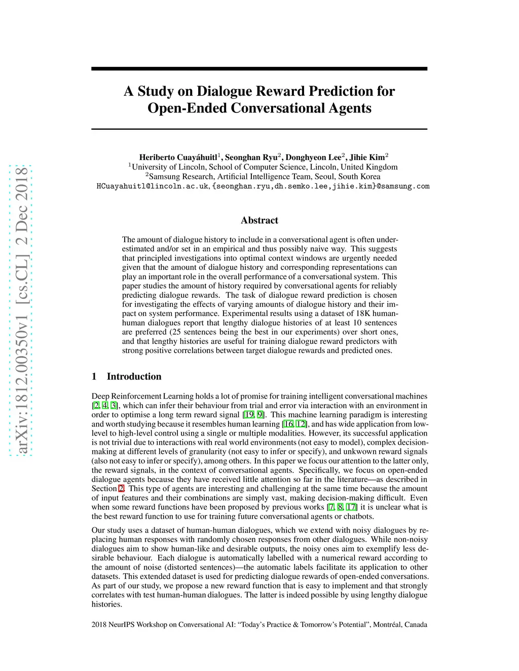 The amount of dialogue history to include in a conversational agent is often underestimated and/or set in an empirical and thus possibly naive way. This suggests that principled investigations into optimal context windows are urgently needed given that the amount of dialogue history and corresponding representations can play an important role in the overall performance of a conversational system. This paper studies the amount of history required by conversational agents for reliably predicting dialogue rewards. The task of dialogue reward prediction is chosen for investigating the effects of varying amounts of dialogue history and their impact on system performance. Experimental results using a dataset of 18K human-human dialogues report that lengthy dialogue histories of at least 10 sentences are preferred (25 sentences being the best in our experiments) over short ones, and that lengthy histories are useful for training dialogue reward predictors with strong positive correlations between target dialogue rewards and predicted ones.