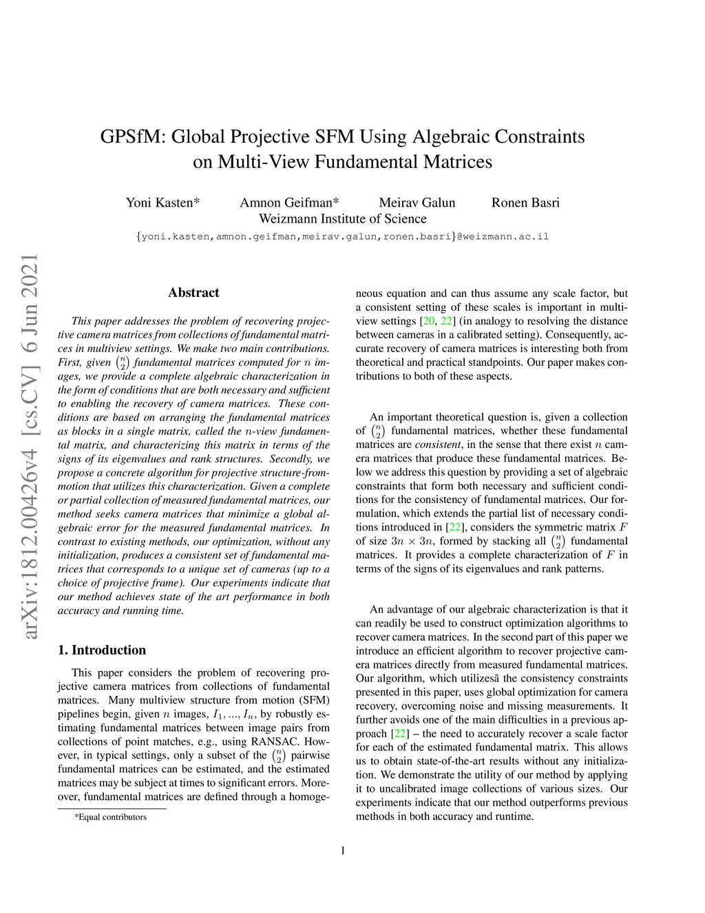 GPSfM: Global Projective SFM Using Algebraic Constraints on Multi-View