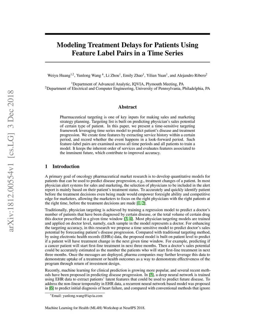 Pharmaceutical targeting is one of key inputs for making sales and marketing strategy planning. Targeting list is built on predicting physician's sales potential of certain type of patient. In this paper, we present a time-sensitive targeting framework leveraging time series model to predict patient's disease and treatment progression. We create time features by extracting service history within a certain period, and record whether the event happens in a look-forward period. Such feature-label pairs are examined across all time periods and all patients to train a model. It keeps the inherent order of services and evaluates features associated to the imminent future, which contribute to improved accuracy.