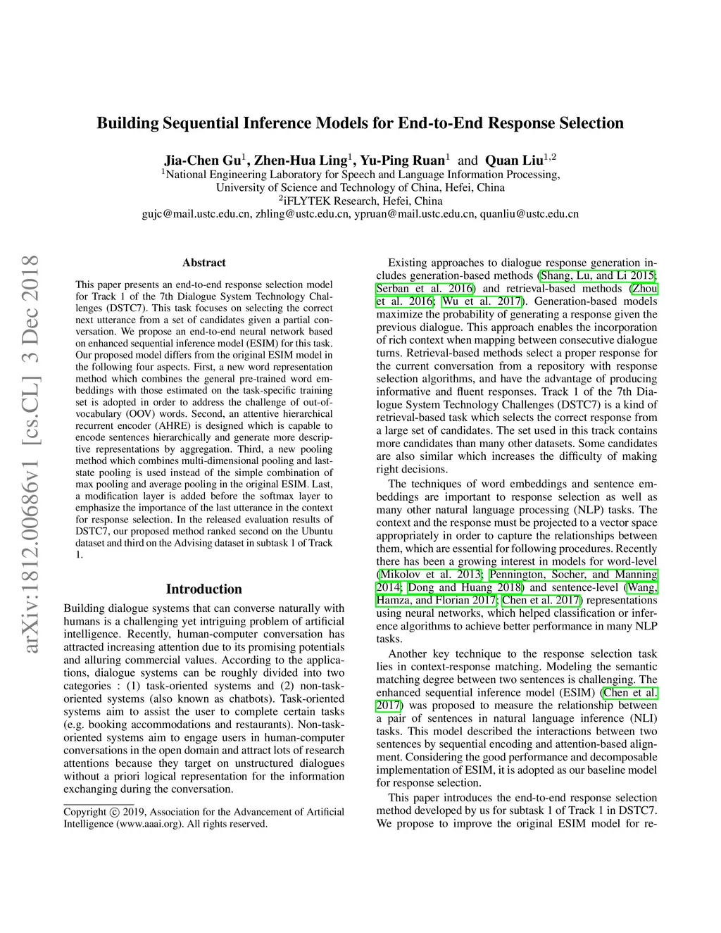 This paper presents an end-to-end response selection model for Track 1 of the 7th Dialogue System Technology Challenges (DSTC7). This task focuses on selecting the correct next utterance from a set of candidates given a partial conversation. We propose an end-to-end neural network based on enhanced sequential inference model (ESIM) for this task. Our proposed model differs from the original ESIM model in the following four aspects. First, a new word representation method which combines the general pre-trained word embeddings with those estimated on the task-specific training set is adopted in order to address the challenge of out-of-vocabulary (OOV) words. Second, an attentive hierarchical recurrent encoder (AHRE) is designed which is capable to encode sentences hierarchically and generate more descriptive representations by aggregation. Third, a new pooling method which combines multi-dimensional pooling and last-state pooling is used instead of the simple combination of max pooling and average pooling in the original ESIM. Last, a modification layer is added before the softmax layer to emphasize the importance of the last utterance in the context for response selection. In the released evaluation results of DSTC7, our proposed method ranked second on the Ubuntu dataset and third on the Advising dataset in subtask 1 of Track 1.