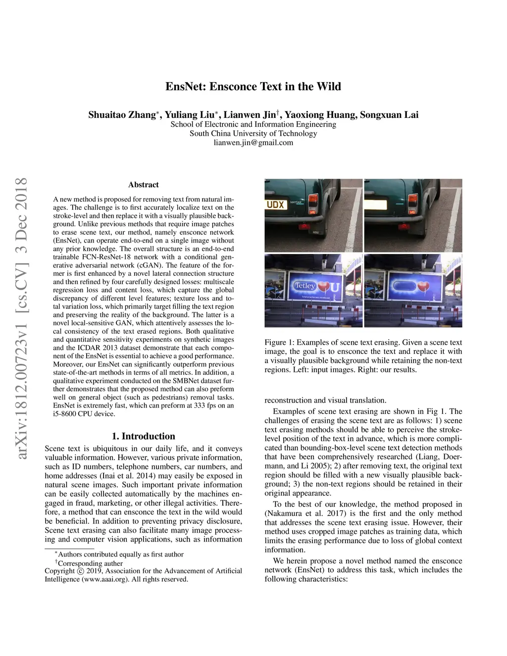 A new method is proposed for removing text from natural images. The challenge is to first accurately localize text on the stroke-level and then replace it with a visually plausible background. Unlike previous methods that require image patches to erase scene text, our method, namely ensconce network (EnsNet), can operate end-to-end on a single image without any prior knowledge. The overall structure is an end-to-end trainable FCN-ResNet-18 network with a conditional generative adversarial network (cGAN). The feature of the former is first enhanced by a novel lateral connection structure and then refined by four carefully designed losses: multiscale regression loss and content loss, which capture the global discrepancy of different level features; texture loss and total variation loss, which primarily target filling the text region and preserving the reality of the background. The latter is a novel local-sensitive GAN, which attentively assesses the local consistency of the text erased regions. Both qualitative and quantitative sensitivity experiments on synthetic images and the ICDAR 2013 dataset demonstrate that each component of the EnsNet is essential to achieve a good performance. Moreover, our EnsNet can significantly outperform previous state-of-the-art methods in terms of all metrics. In addition, a qualitative experiment conducted on the SMBNet dataset further demonstrates that the proposed method can also preform well on general object (such as pedestrians) removal tasks. EnsNet is extremely fast, which can preform at 333 fps on an i5-8600 CPU device.