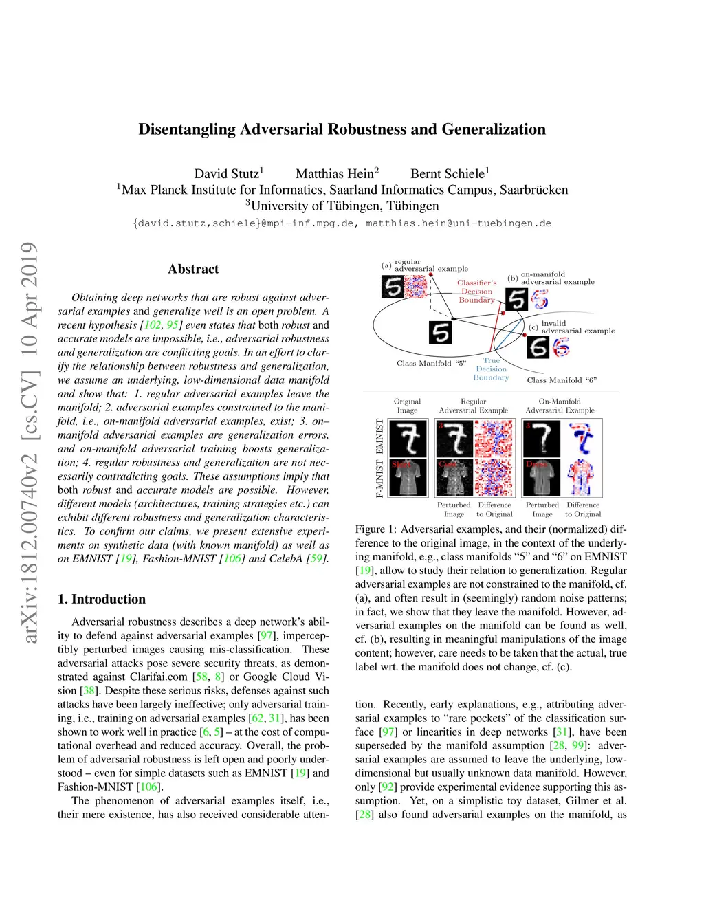 Obtaining deep networks that are robust against adversarial examples and generalize well is an open problem. A recent hypothesis even states that both robust and accurate models are impossible, i.e., adversarial robustness and generalization are conflicting goals. In an effort to clarify the relationship between robustness and generalization, we assume an underlying, low-dimensional data manifold and show that: 1. regular adversarial examples leave the manifold; 2. adversarial examples constrained to the manifold, i.e., on-manifold adversarial examples, exist; 3. on-manifold adversarial examples are generalization errors, and on-manifold adversarial training boosts generalization; 4. regular robustness and generalization are not necessarily contradicting goals. These assumptions imply that both robust and accurate models are possible. However, different models (architectures, training strategies etc.) can exhibit different robustness and generalization characteristics. To confirm our claims, we present extensive experiments on synthetic data (with known manifold) as well as on EMNIST, Fashion-MNIST and CelebA.