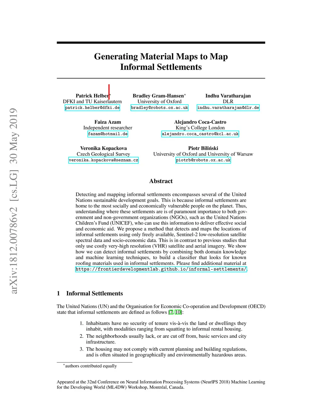 Detecting and mapping informal settlements encompasses several of the United Nations sustainable development goals. This is because informal settlements are home to the most socially and economically vulnerable people on the planet. Thus, understanding where these settlements are is of paramount importance to both government and non-government organizations (NGOs), such as the United Nations Children's Fund (UNICEF), who can use this information to deliver effective social and economic aid. We propose a method that detects and maps the locations of informal settlements using only freely available, Sentinel-2 low-resolution satellite spectral data and socio-economic data. This is in contrast to previous studies that only use costly very-high resolution (VHR) satellite and aerial imagery. We show how we can detect informal settlements by combining both domain knowledge and machine learning techniques, to build a classifier that looks for known roofing materials used in informal settlements. Please find additional material at https://frontierdevelopmentlab.github.io/informal-settlements/.