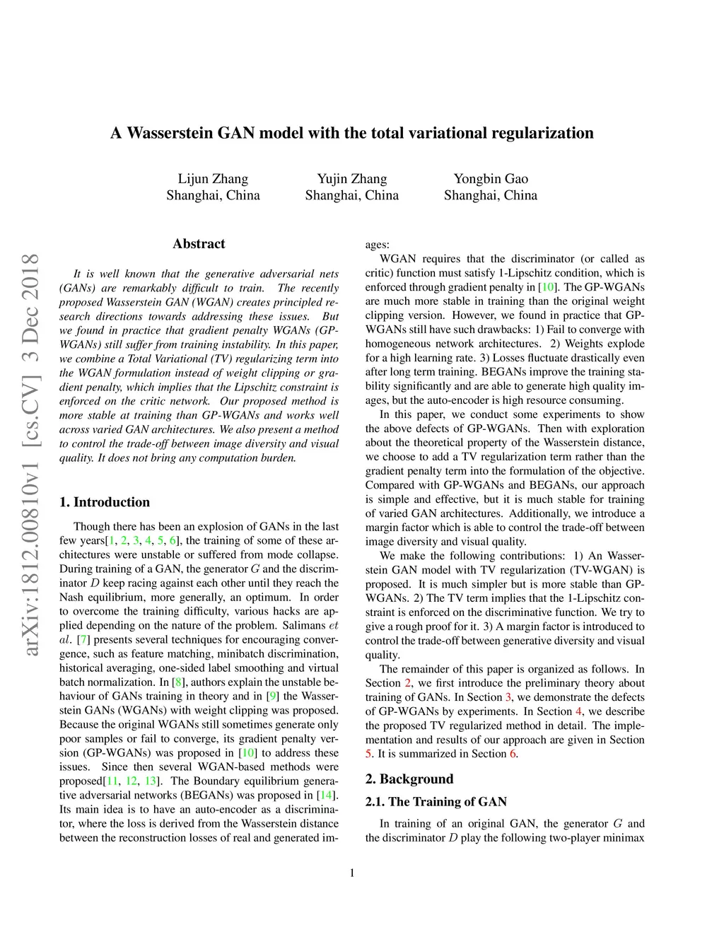 It is well known that the generative adversarial nets (GANs) are remarkably difficult to train. The recently proposed Wasserstein GAN (WGAN) creates principled research directions towards addressing these issues. But we found in practice that gradient penalty WGANs (GP-WGANs) still suffer from training instability. In this paper, we combine a Total Variational (TV) regularizing term into the WGAN formulation instead of weight clipping or gradient penalty, which implies that the Lipschitz constraint is enforced on the critic network. Our proposed method is more stable at training than GP-WGANs and works well across varied GAN architectures. We also present a method to control the trade-off between image diversity and visual quality. It does not bring any computation burden.