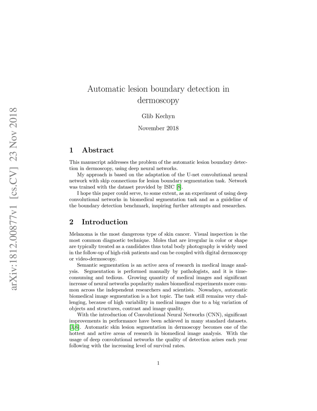 This manuscript addresses the problem of the automatic lesion boundary detection in dermoscopy, using deep neural networks. An approach is based on the adaptation of the U-net convolutional neural network with skip connections for lesion boundary segmentation task. I hope this paper could serve, to some extent, as an experiment of using deep convolutional networks in biomedical segmentation task and as a guideline of the boundary detection benchmark, inspiring further attempts and researches.