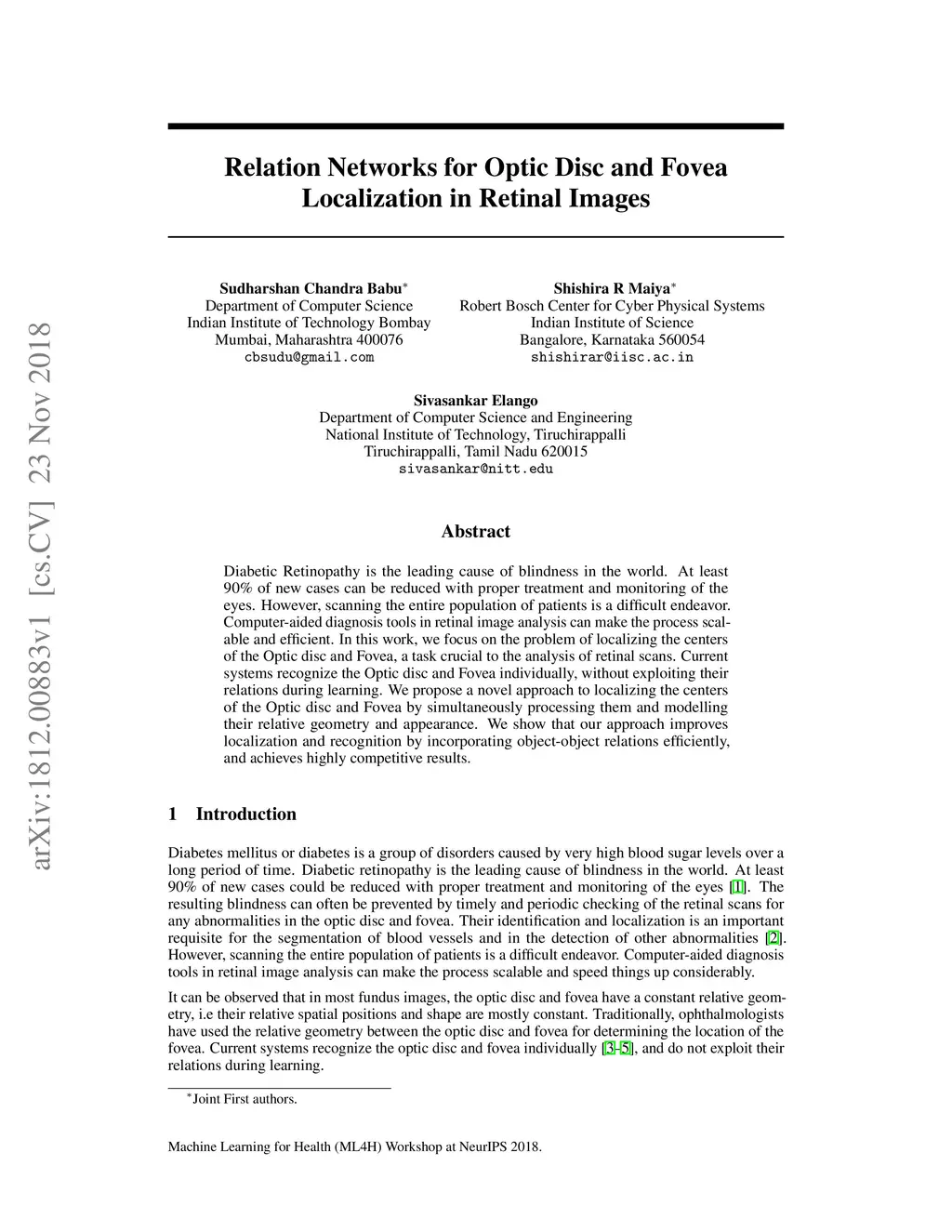 Diabetic Retinopathy is the leading cause of blindness in the world. At least 90\% of new cases can be reduced with proper treatment and monitoring of the eyes. However, scanning the entire population of patients is a difficult endeavor. Computer-aided diagnosis tools in retinal image analysis can make the process scalable and efficient. In this work, we focus on the problem of localizing the centers of the Optic disc and Fovea, a task crucial to the analysis of retinal scans. Current systems recognize the Optic disc and Fovea individually, without exploiting their relations during learning. We propose a novel approach to localizing the centers of the Optic disc and Fovea by simultaneously processing them and modeling their relative geometry and appearance. We show that our approach improves localization and recognition by incorporating object-object relations efficiently, and achieves highly competitive results.