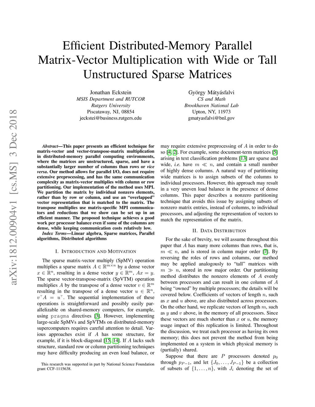 This paper presents an efficient technique for matrix-vector and vector-transpose-matrix multiplication in distributed-memory parallel computing environments, where the matrices are unstructured, sparse, and have a substantially larger number of columns than rows or vice versa. Our method allows for parallel I/O, does not require extensive preprocessing, and has the same communication complexity as matrix-vector multiplies with column or row partitioning. Our implementation of the method uses MPI. We partition the matrix by individual nonzero elements, rather than by row or column, and use an "overlapped" vector representation that is matched to the matrix. The transpose multiplies use matrix-specific MPI communicators and reductions that we show can be set up in an efficient manner. The proposed technique achieves a good work per processor balance even if some of the columns are dense, while keeping communication costs relatively low.
