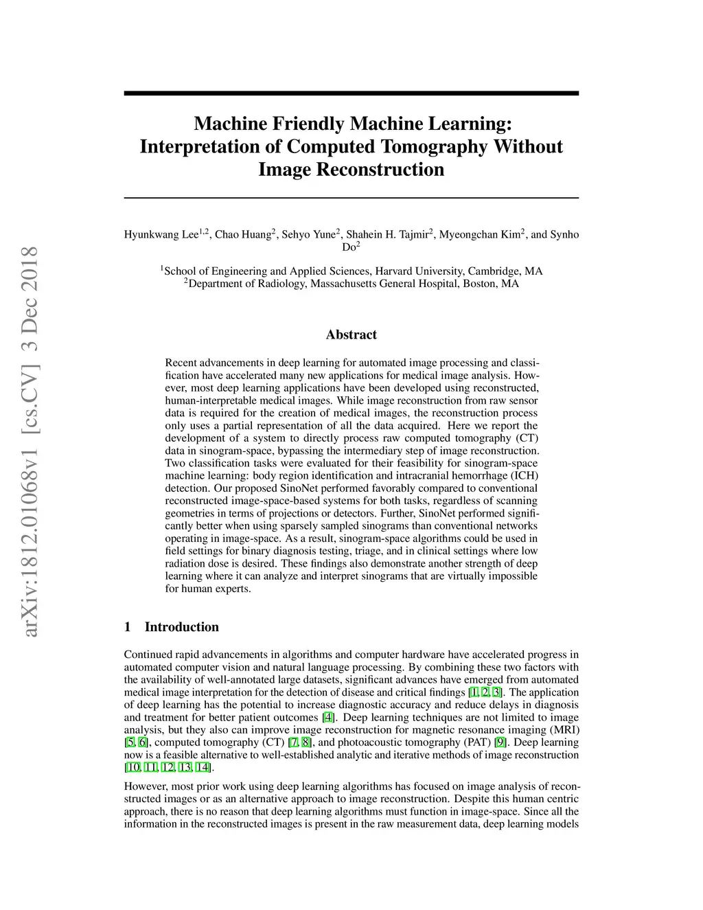 Recent advancements in deep learning for automated image processing and classification have accelerated many new applications for medical image analysis. However, most deep learning applications have been developed using reconstructed, human-interpretable medical images. While image reconstruction from raw sensor data is required for the creation of medical images, the reconstruction process only uses a partial representation of all the data acquired. Here we report the development of a system to directly process raw computed tomography (CT) data in sinogram-space, bypassing the intermediary step of image reconstruction. Two classification tasks were evaluated for their feasibility for sinogram-space machine learning: body region identification and intracranial hemorrhage (ICH) detection. Our proposed SinoNet performed favorably compared to conventional reconstructed image-space-based systems for both tasks, regardless of scanning geometries in terms of projections or detectors. Further, SinoNet performed significantly better when using sparsely sampled sinograms than conventional networks operating in image-space. As a result, sinogram-space algorithms could be used in field settings for binary diagnosis testing, triage, and in clinical settings where low radiation dose is desired. These findings also demonstrate another strength of deep learning where it can analyze and interpret sinograms that are virtually impossible for human experts.