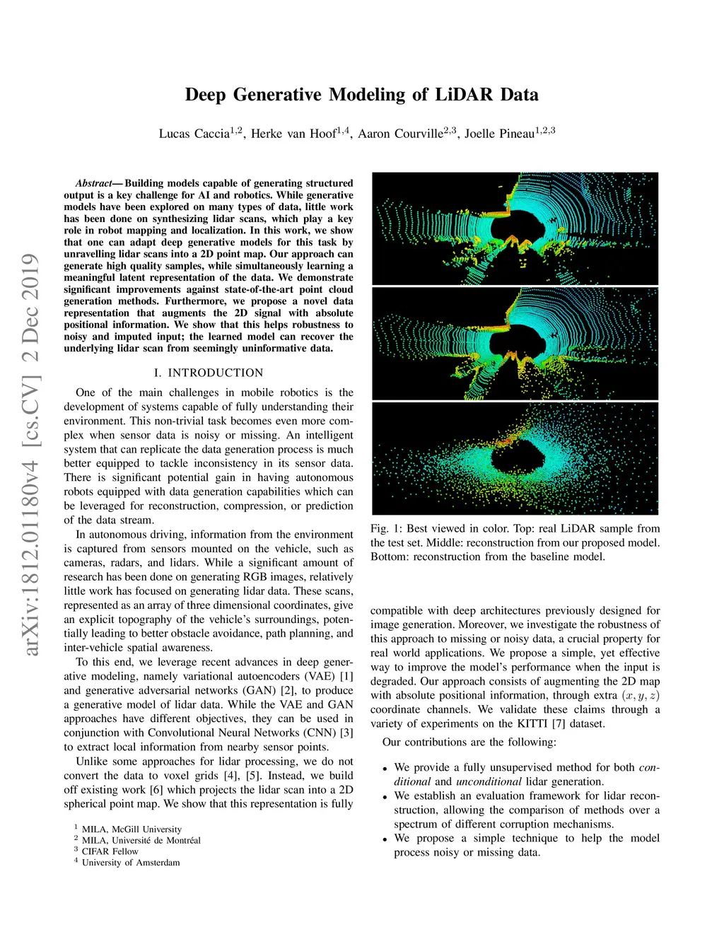 Building models capable of generating structured output is a key challenge for AI and robotics. While generative models have been explored on many types of data, little work has been done on synthesizing lidar scans, which play a key role in robot mapping and localization. In this work, we show that one can adapt deep generative models for this task by unravelling lidar scans into a 2D point map. Our approach can generate high quality samples, while simultaneously learning a meaningful latent representation of the data. We demonstrate significant improvements against state-of-the-art point cloud generation methods. Furthermore, we propose a novel data representation that augments the 2D signal with absolute positional information. We show that this helps robustness to noisy and imputed input; the learned model can recover the underlying lidar scan from seemingly uninformative data