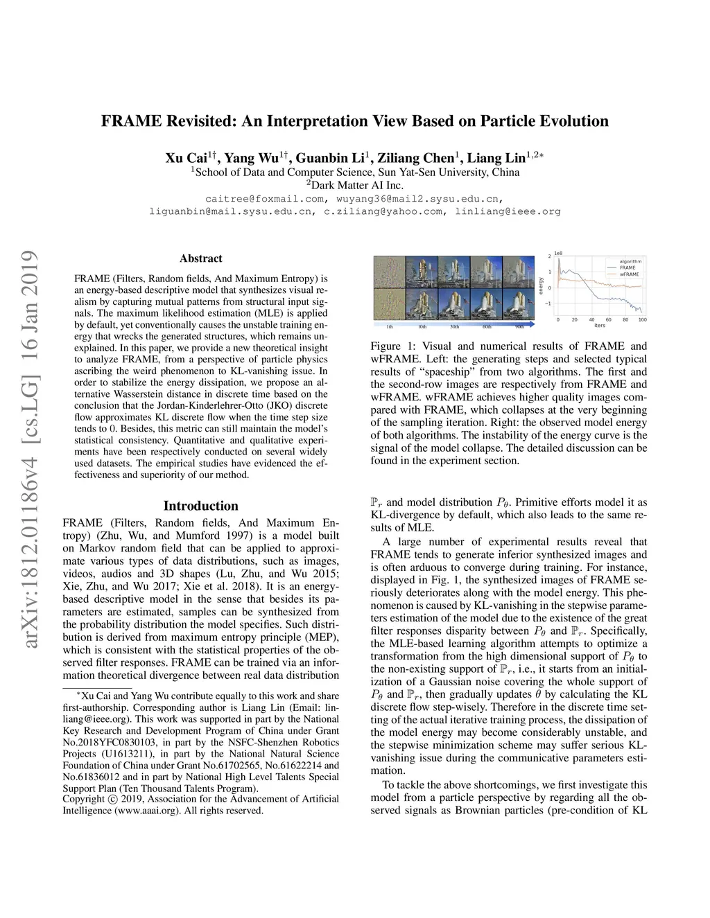 FRAME (Filters, Random fields, And Maximum Entropy) is an energy-based descriptive model that synthesizes visual realism by capturing mutual patterns from structural input signals. The maximum likelihood estimation (MLE) is applied by default, yet conventionally causes the unstable training energy that wrecks the generated structures, which remains unexplained. In this paper, we provide a new theoretical insight to analyze FRAME, from a perspective of particle physics ascribing the weird phenomenon to KL-vanishing issue. In order to stabilize the energy dissipation, we propose an alternative Wasserstein distance in discrete time based on the conclusion that the Jordan-Kinderlehrer-Otto (JKO) discrete flow approximates KL discrete flow when the time step size tends to 0. Besides, this metric can still maintain the model's statistical consistency. Quantitative and qualitative experiments have been respectively conducted on several widely used datasets. The empirical studies have evidenced the effectiveness and superiority of our method.