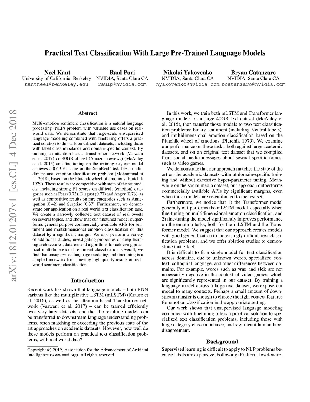 Multi-emotion sentiment classification is a natural language processing (NLP) problem with valuable use cases on real-world data. We demonstrate that large-scale unsupervised language modeling combined with finetuning offers a practical solution to this task on difficult datasets, including those with label class imbalance and domain-specific context. By training an attention-based Transformer network (Vaswani et al. 2017) on 40GB of text (Amazon reviews) (McAuley et al. 2015) and fine-tuning on the training set, our model achieves a 0.69 F1 score on the SemEval Task 1:E-c multi-dimensional emotion classification problem (Mohammad et al. 2018), based on the Plutchik wheel of emotions (Plutchik 1979). These results are competitive with state of the art models, including strong F1 scores on difficult (emotion) categories such as Fear (0.73), Disgust (0.77) and Anger (0.78), as well as competitive results on rare categories such as Anticipation (0.42) and Surprise (0.37). Furthermore, we demonstrate our application on a real world text classification task. We create a narrowly collected text dataset of real tweets on several topics, and show that our finetuned model outperforms general purpose commercially available APIs for sentiment and multidimensional emotion classification on this dataset by a significant margin. We also perform a variety of additional studies, investigating properties of deep learning architectures, datasets and algorithms for achieving practical multidimensional sentiment classification. Overall, we find that unsupervised language modeling and finetuning is a simple framework for achieving high quality results on real-world sentiment classification.