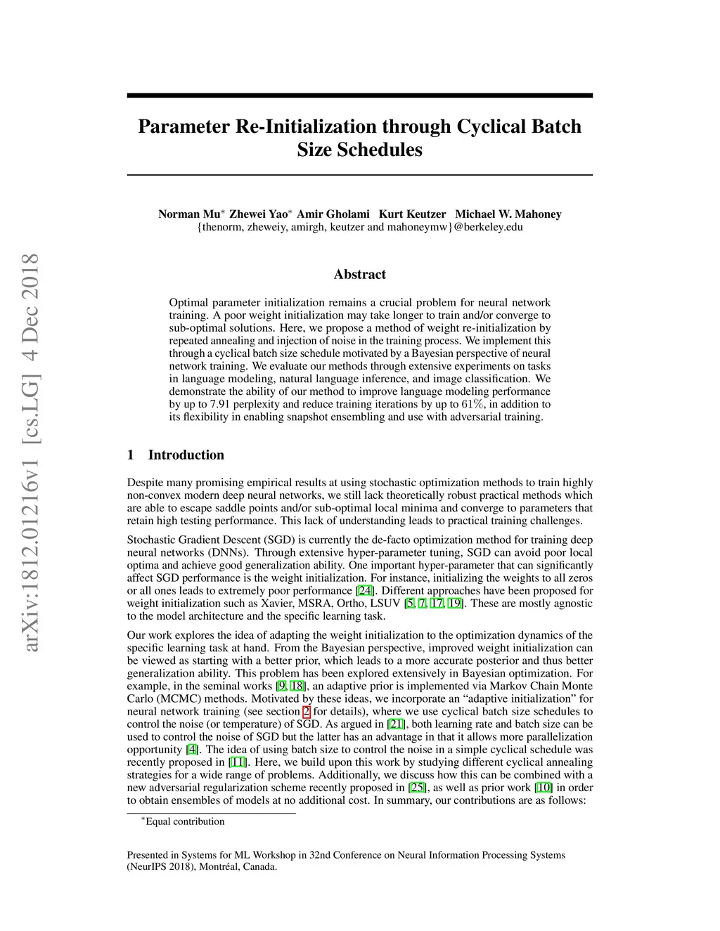 Optimal parameter initialization remains a crucial problem for neural network training. A poor weight initialization may take longer to train and/or converge to sub-optimal solutions. Here, we propose a method of weight re-initialization by repeated annealing and injection of noise in the training process. We implement this through a cyclical batch size schedule motivated by a Bayesian perspective of neural network training. We evaluate our methods through extensive experiments on tasks in language modeling, natural language inference, and image classification. We demonstrate the ability of our method to improve language modeling performance by up to 7.91 perplexity and reduce training iterations by up to , in addition to its flexibility in enabling snapshot ensembling and use with adversarial training.
