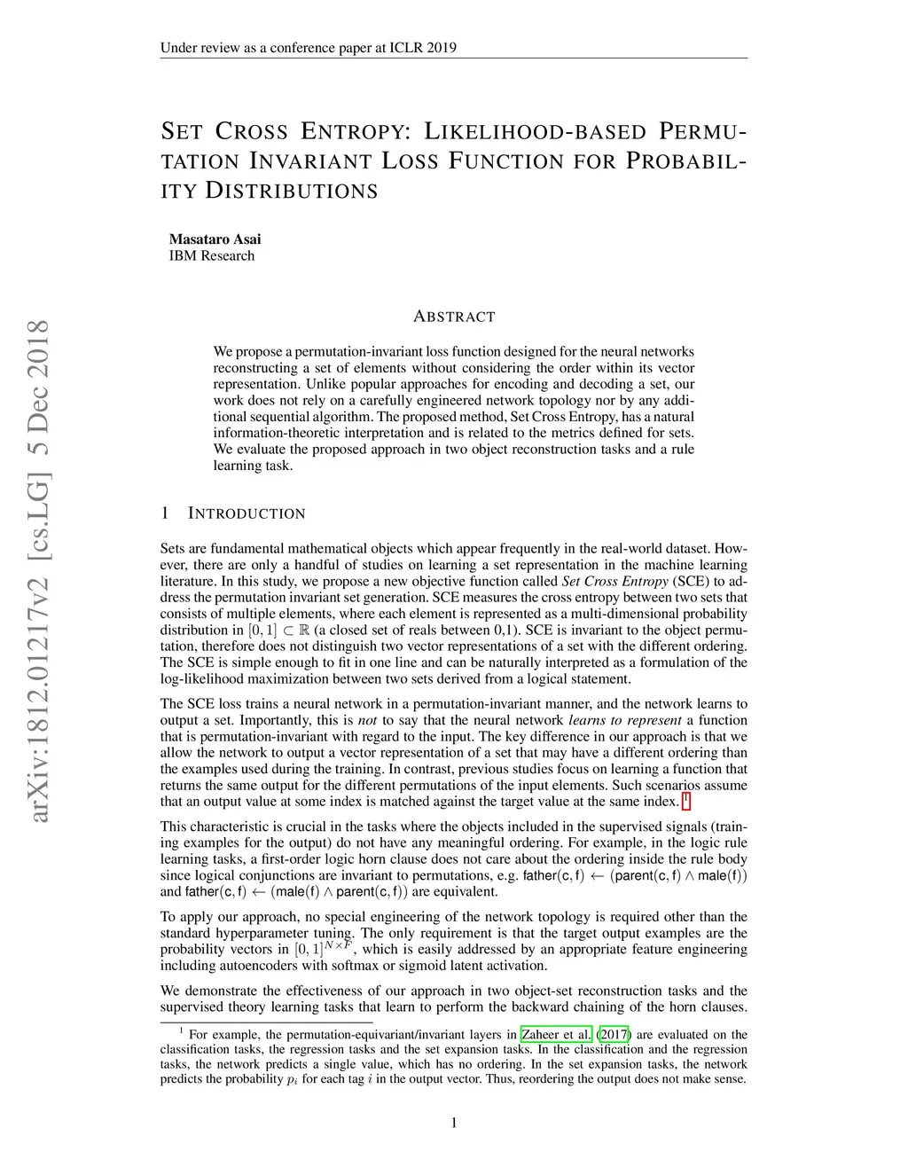 We propose a permutation-invariant loss function designed for the neural networks reconstructing a set of elements without considering the order within its vector representation. Unlike popular approaches for encoding and decoding a set, our work does not rely on a carefully engineered network topology nor by any additional sequential algorithm. The proposed method, Set Cross Entropy, has a natural information-theoretic interpretation and is related to the metrics defined for sets. We evaluate the proposed approach in two object reconstruction tasks and a rule learning task.