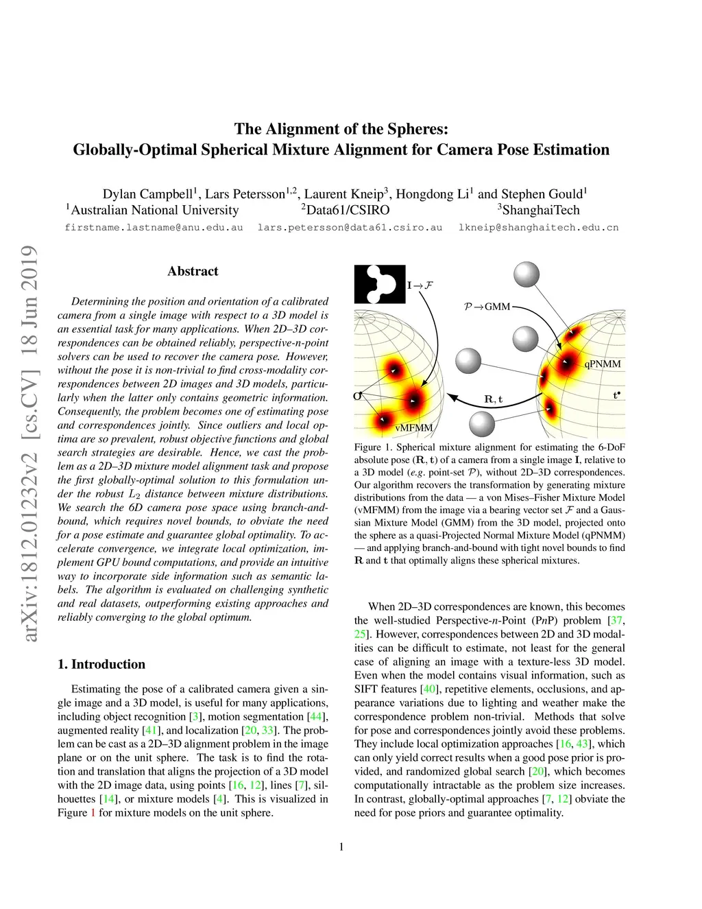 Determining the position and orientation of a calibrated camera from a single image with respect to a 3D model is an essential task for many applications. When 2D-3D correspondences can be obtained reliably, perspective-n-point solvers can be used to recover the camera pose. However, without the pose it is non-trivial to find cross-modality correspondences between 2D images and 3D models, particularly when the latter only contains geometric information. Consequently, the problem becomes one of estimating pose and correspondences jointly. Since outliers and local optima are so prevalent, robust objective functions and global search strategies are desirable. Hence, we cast the problem as a 2D-3D mixture model alignment task and propose the first globally-optimal solution to this formulation under the robust distance between mixture distributions. We search the 6D camera pose space using branch-and-bound, which requires novel bounds, to obviate the need for a pose estimate and guarantee global optimality. To accelerate convergence, we integrate local optimization, implement GPU bound computations, and provide an intuitive way to incorporate side information such as semantic labels. The algorithm is evaluated on challenging synthetic and real datasets, outperforming existing approaches and reliably converging to the global optimum.