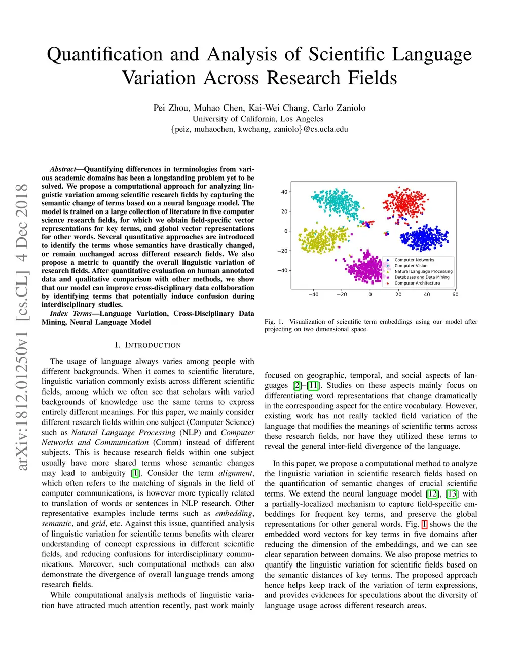 Quantifying differences in terminologies from various academic domains has been a longstanding problem yet to be solved. We propose a computational approach for analyzing linguistic variation among scientific research fields by capturing the semantic change of terms based on a neural language model. The model is trained on a large collection of literature in five computer science research fields, for which we obtain field-specific vector representations for key terms, and global vector representations for other words. Several quantitative approaches are introduced to identify the terms whose semantics have drastically changed, or remain unchanged across different research fields. We also propose a metric to quantify the overall linguistic variation of research fields. After quantitative evaluation on human annotated data and qualitative comparison with other methods, we show that our model can improve cross-disciplinary data collaboration by identifying terms that potentially induce confusion during interdisciplinary studies.